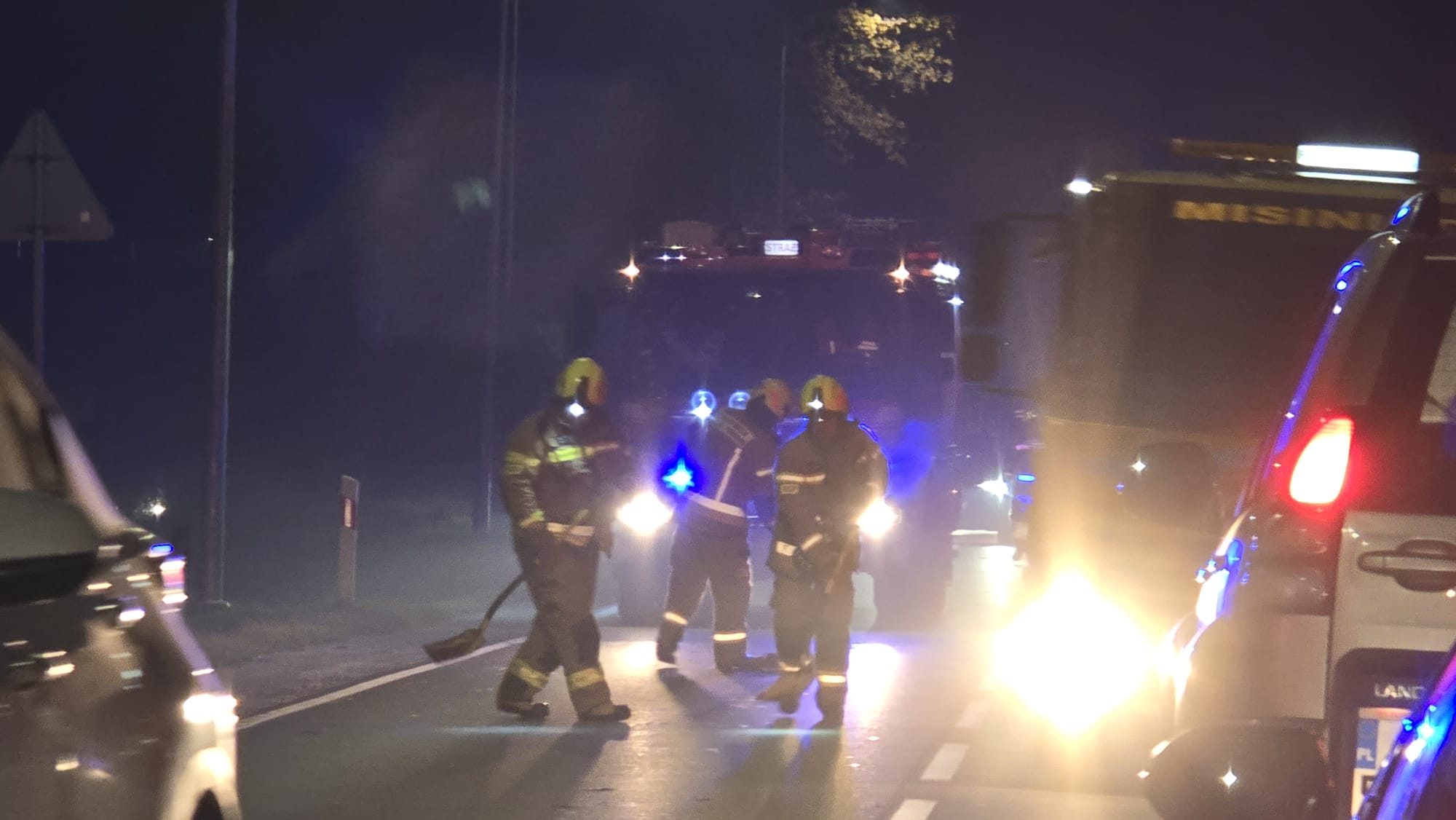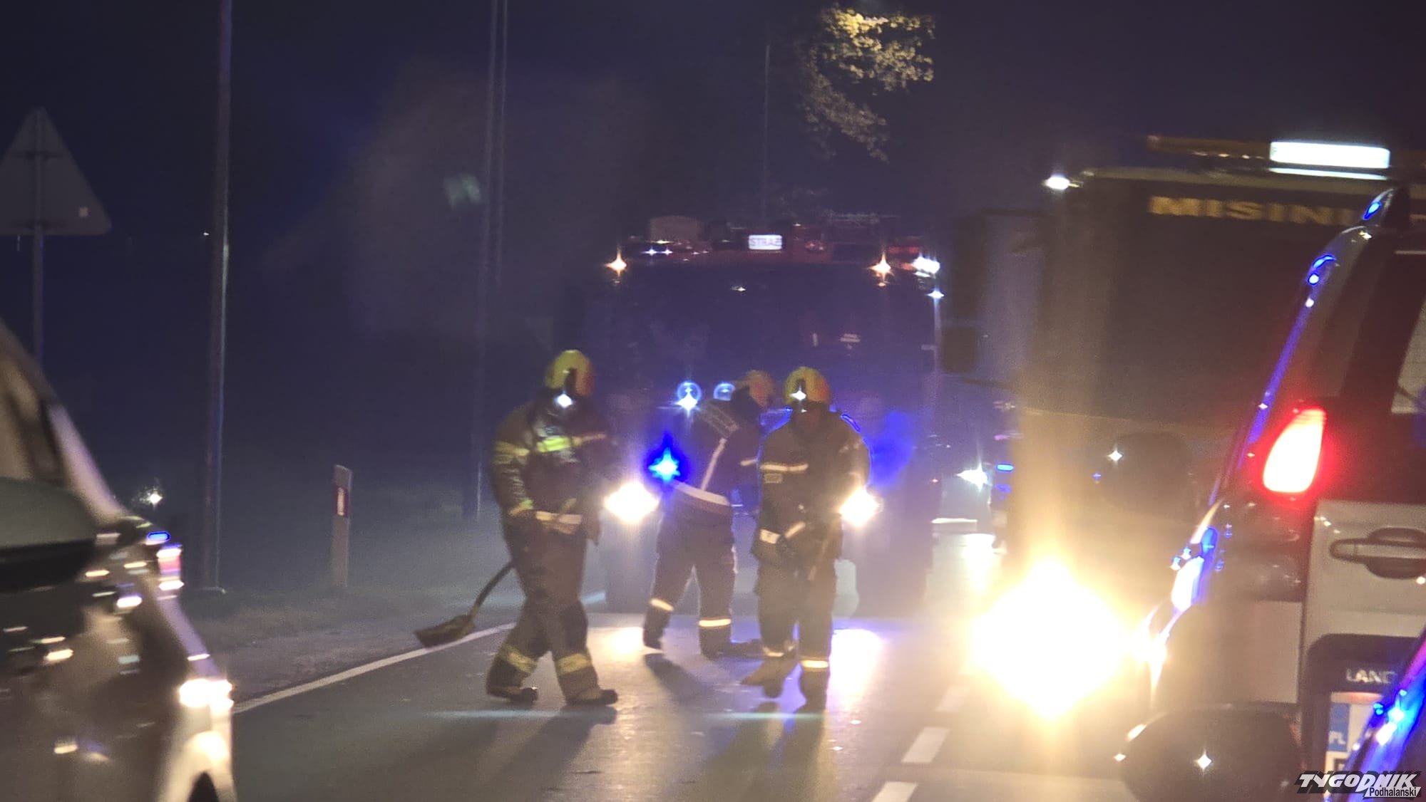 W Białym Dunajcu strażacy oczyszczają zabrudzoną jezdnię.