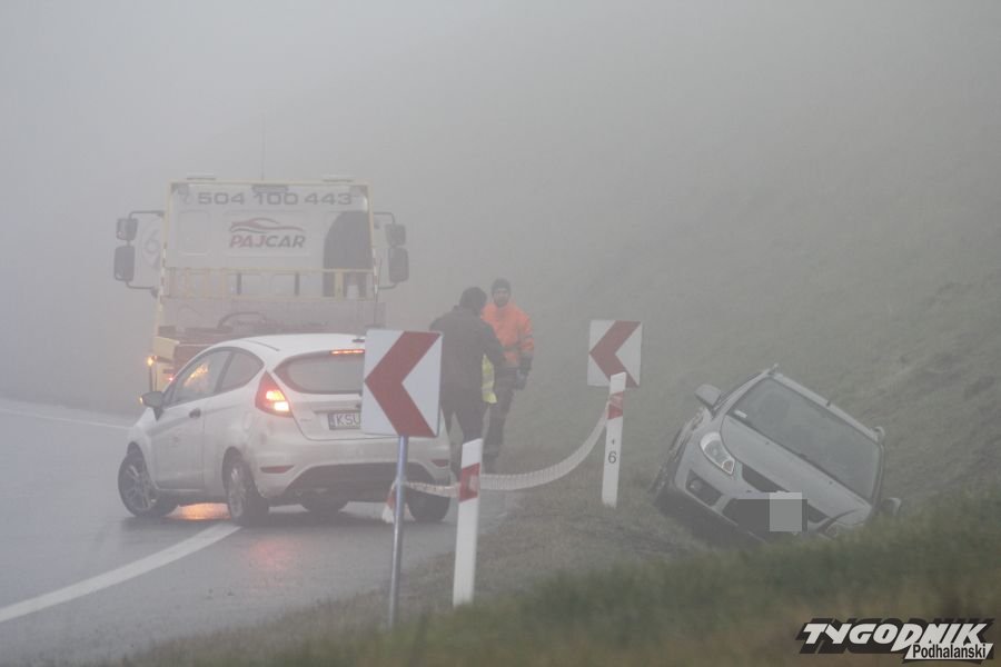 Wypadek zdarzył się przed Obidową, na pasie w kierunku Krakowa, w miejscu, gdzie dwupasmówka ostro skręca w lewo. Kierowca auta osobowego stracił panowanie nad kierownicą. Samochód wypadł z drogi i z sporą siłą uderzył w nasyp drogowy. Do wypadku doszło w trudnych warunkach. Zakopianka jest mokra i śliska, pada rzęsisty deszcz a widoczność ogranicza gęsta mgła. W miejscu wypadku ruch odbywa się jednym pasem. Na miejscu pracują strażacy, policjanci i ekipa pomocy drogowej.