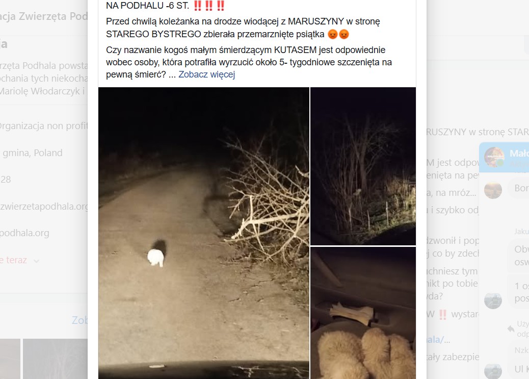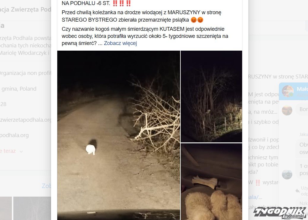 Na Podhalu panują obecnie temperatury sięgające -6°C. W takich warunkach jedna z mieszkanek regionu, jadąc drogą z Maruszyny w kierunku Starego Bystrego, natknęła się na porzucone, przemarznięte szczenięta. Zwierzęta miały zaledwie około pięciu tygodni i pozostawione same sobie były narażone na pewną śmierć.