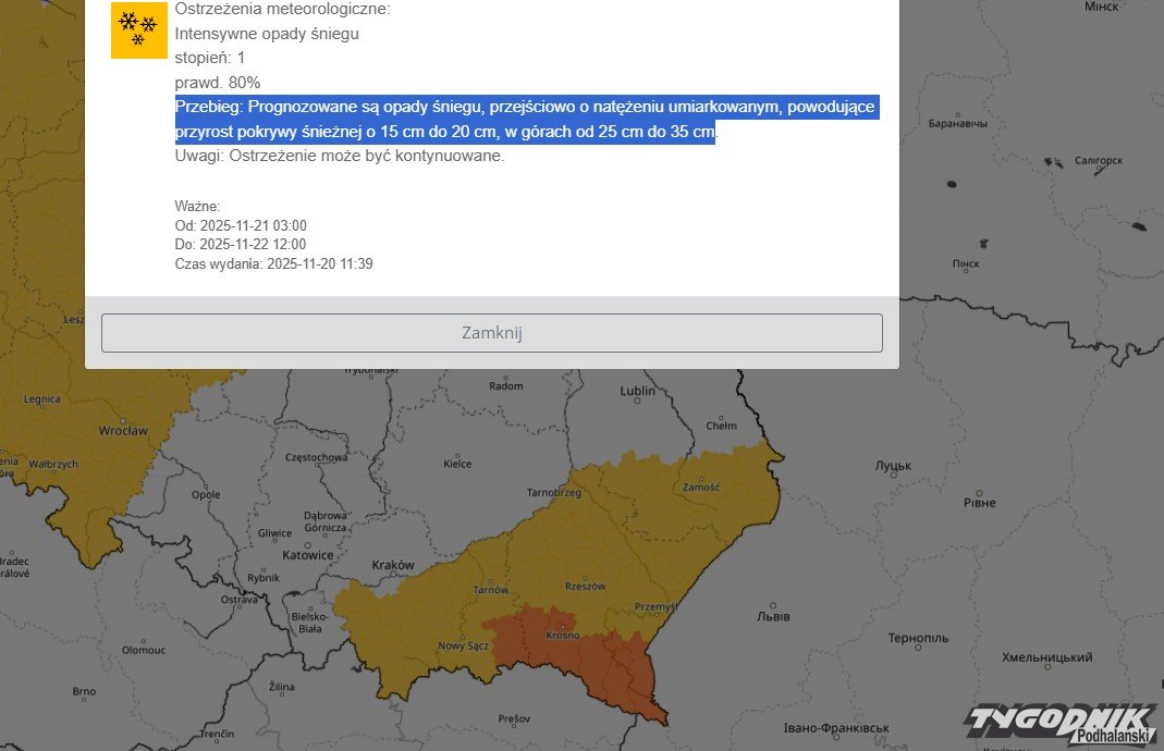 Zgodnie z przewidywaniami Instytut Meteorologii i Gospodarki Wodnej wydał ostrzeżenie pierwszego przed intensywnymi opadami śniegu. Obowiązuje ono w powiecie tatrzańskim i nowotarskim od godz. 3 w nocy do południa w piątek: "Prognozowane są opady śniegu, przejściowo o natężeniu umiarkowanym, powodujące przyrost pokrywy śnieżnej o 15 cm do 20 cm, w górach od 25 cm do 35 cm".