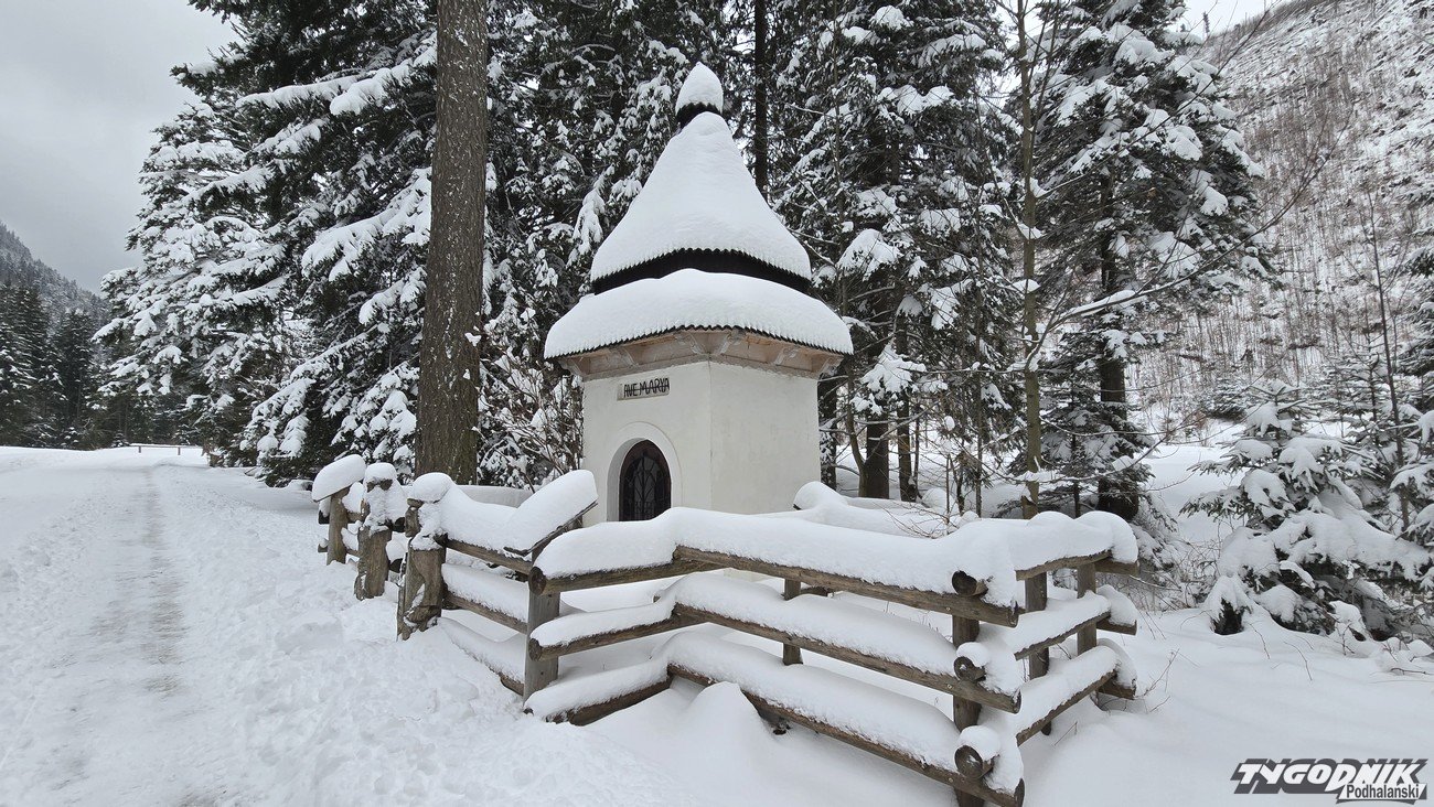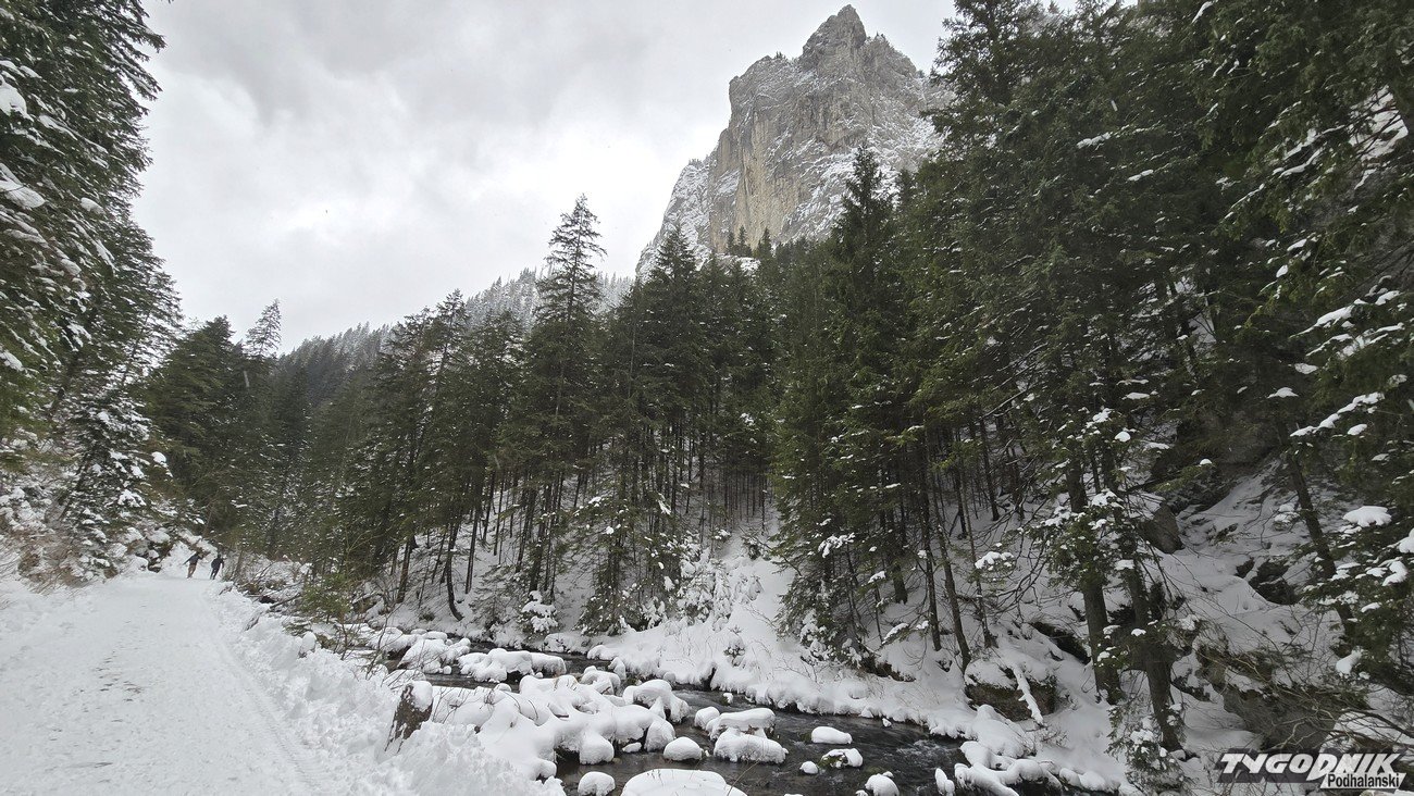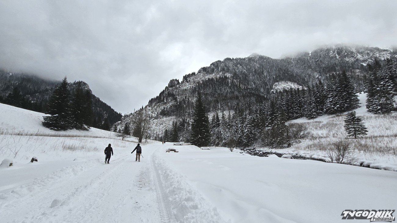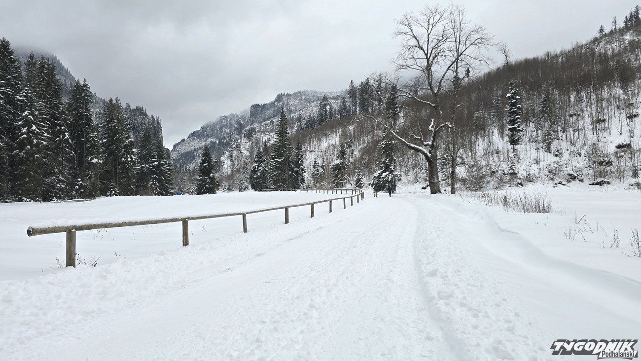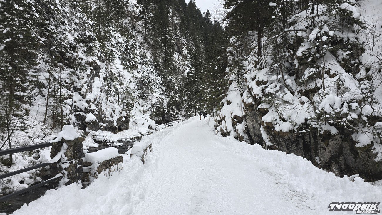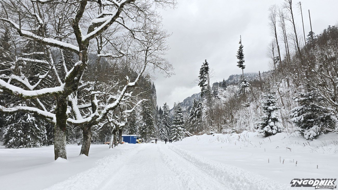 W sobotę śnieg przestał padać, ale kolejne opady zapowiadane są na noc z soboty na niedzielę. Temperatura dziś utrzymuje się poniżej zera. Termometry wskazują -4 st. C. O godz. 9 w Dolinie Kościeliskiej nie było wielu turystów, ale już ok. godz. 11 doliną wędrowało całkiem sporo turystów. Widoki na Bystrą, Kominiarski Wierch z Hali Ornak zasłonięte przez chmury, ale i tak jest pięknie. Niektóre boczne szlaki - jak na Polanę Stoły - zupełnie nieprzetarte. W Tatrach obowiązuje drugi stopień zagrożenia lawinowego (powyżej 1700 metrów n. p. m.), niżej mamy lawinową jedynkę.