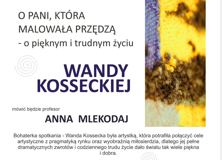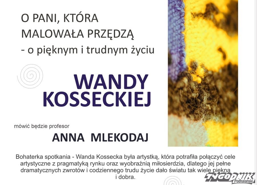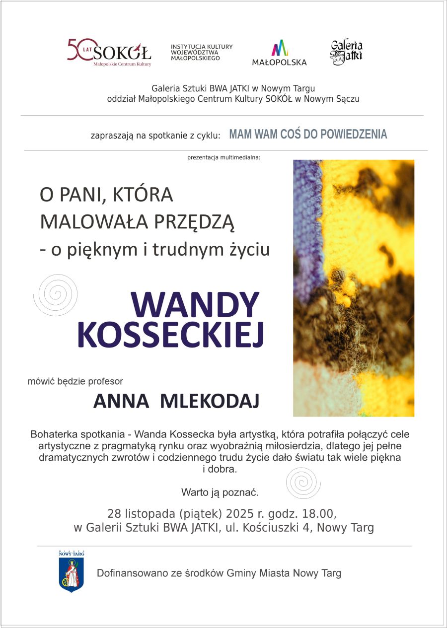 Galeria Sztuki BWA JATKI w Nowym Targu - o/ Małopolskiego Centrum Kultury SOKÓŁ w Nowym Sączu - zaprasza w najbliższy piątek 28.11 o godzinie 18 na prezentację multimedialną: "O pani, która malowała przędzą - o pięknym i trudnym życiu Wandy Kosseckiej".