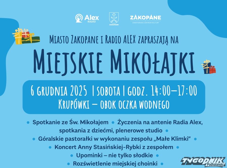 W sobotę 6.12 spotkajmy się przy Oczku Wodnym na Krupówkach. To właśnie tam, w świątecznej atmosferze, Święty Mikołaj wraz z Radiem Alex zaproszą wszystkich m.in. do wspólnego rozświetlenia miejskiej choinki, które oficjalnie rozpocznie magiczny czas Bożego Narodzenia.