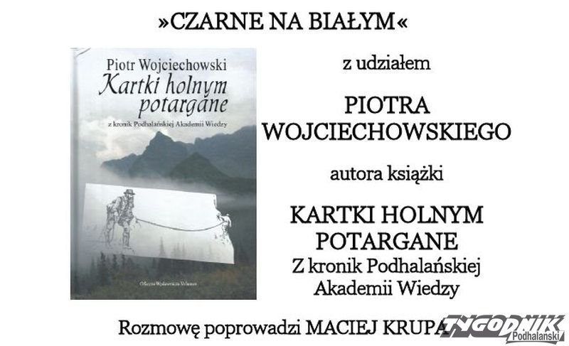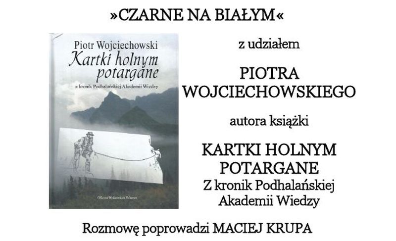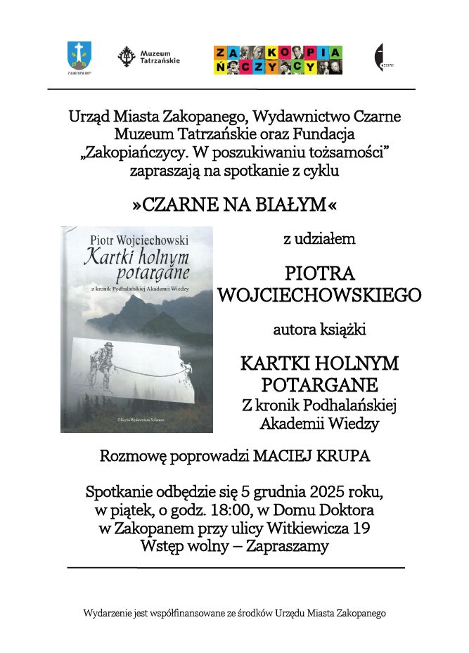 Urząd Miasta Zakopanego, Wydawnictwo Czarne, Muzeum Tatrzańskie, Galeria Dom Doktora oraz Fundacja "Zakopiańczycy. W poszukiwaniu tożsamości" zapraszają na spotkanie z cyklu "Czarne na białym".
