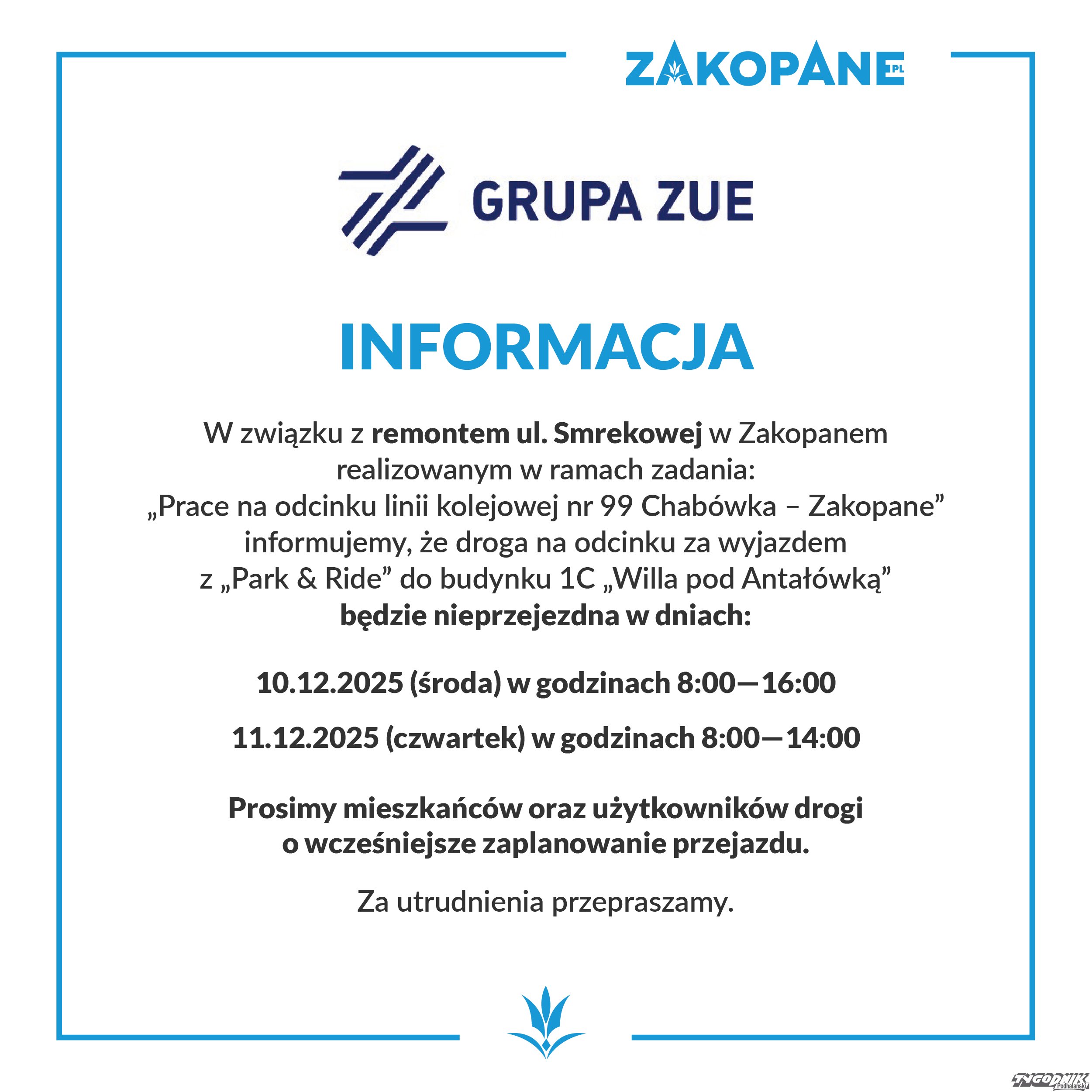 Wykonawca remontu informuje o czasowych utrudnieniach w ruchu na ul. Smrekowej w Zakopanem.