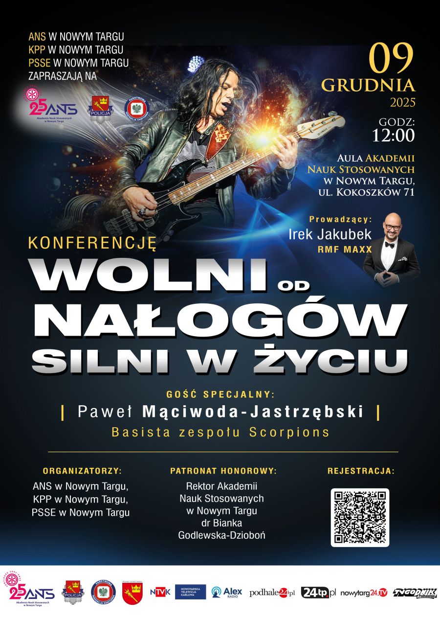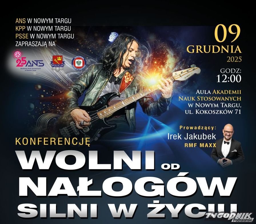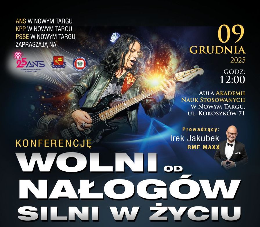 Konferencja skierowana jest do uczniów szkół ponadpodstawowych, studentów, a także do kadry pedagogicznej, nauczycieli i specjalistów pracujących z młodzieżą, służb mundurowych oraz wszystkich osób zainteresowanych tematyką zdrowia i profilaktyki uzależnień. Odbędzie się we wtorek 9.12 w godz. 12.00-14.00, w Auli Akademii Nauk Stosowanych w Nowym Targu.