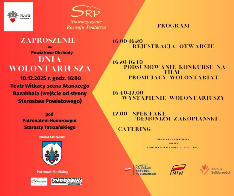 Jedną z tych aktywności są właśnie Powiatowe Obchody Dnia Wolontariusza. Wydarzenie rozpocznie się o godzinie 16 w Teatrze Witkacego w Zakopanem, na Scenie Atanazego Bazakbala. W programie: podsumowanie konkursu na film promujący wolontariat, wystąpienie wolontariuszy oraz spektakl Teatru Witkacego "Demonizm Zakopiański".