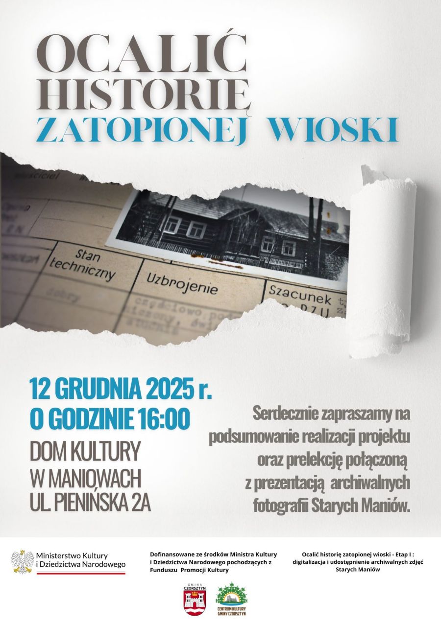 Centrum Kultury Gminy Czorsztyn i Gmina Czorsztyn zapraszają na spotkanie podsumowujące projekt "Ocalić historię zatopionej wioski - Etap I: digitalizacja i udostępnienie archiwalnych zdjęć Starych Maniów", finansowanego ze środków Ministra Kultury i Dziedzictwa Narodowego w ramach programu Kultura Cyfrowa 2025.