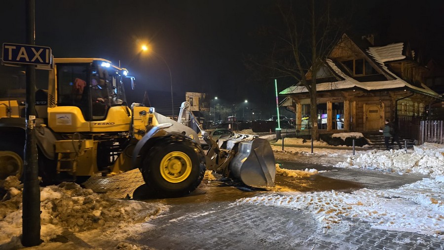 Służby komunalne w Zakopanem usuwają zwały ciężkiego, mokrego śniegu, akcja odśnieżanie prowadzona jest nawet wieczorową porą.