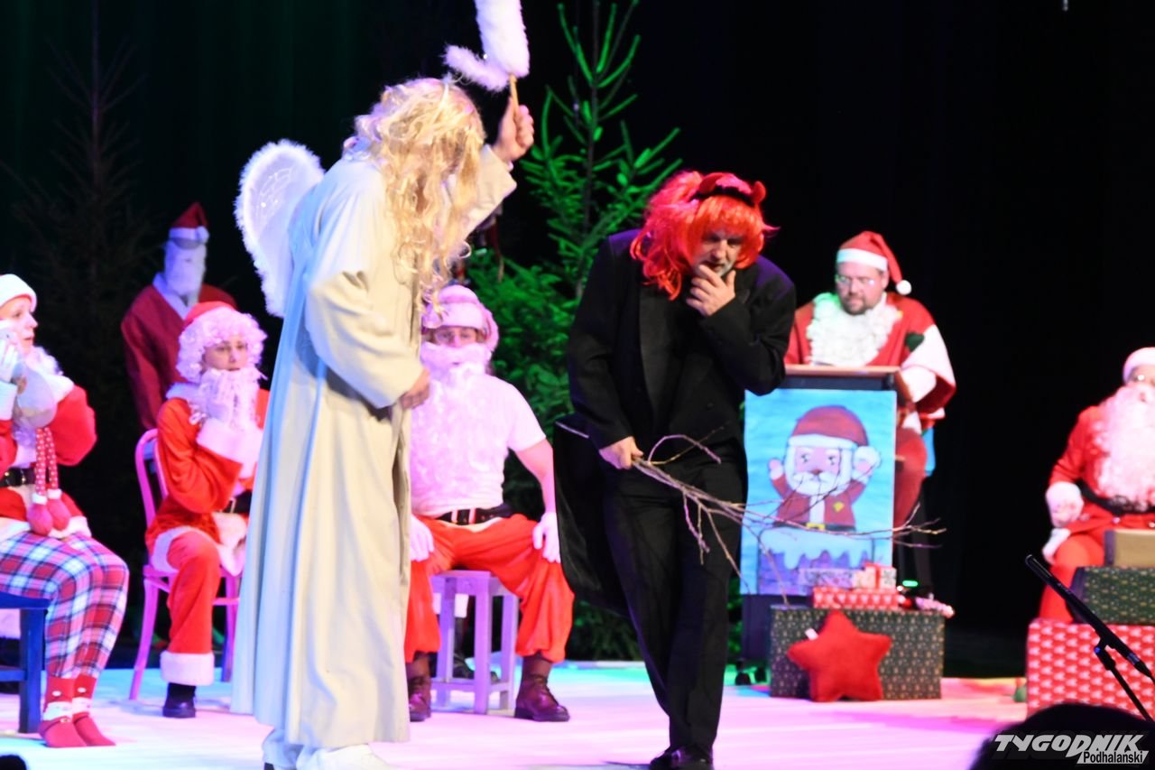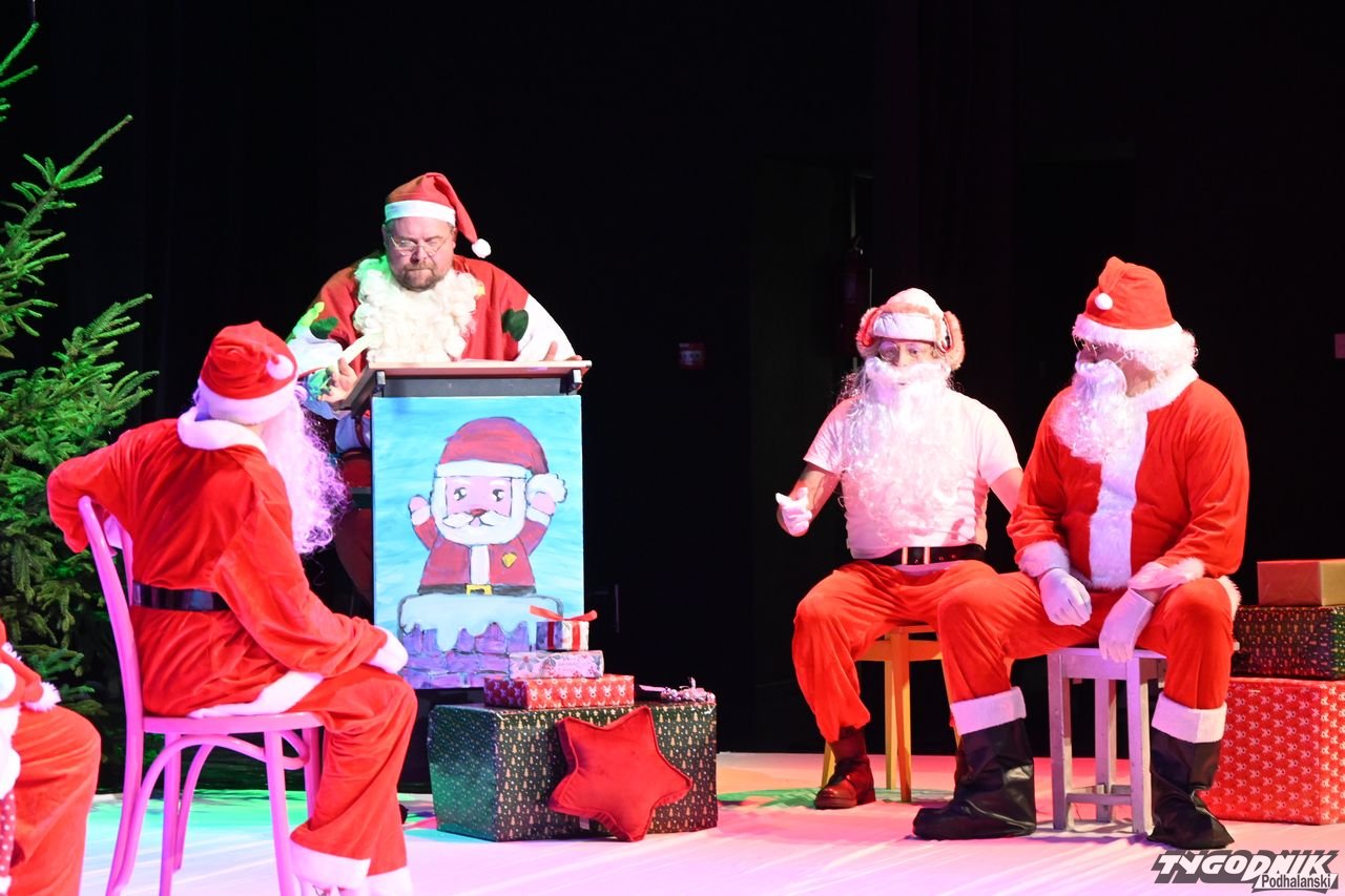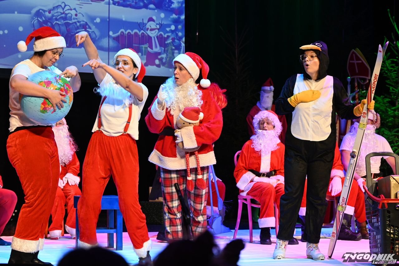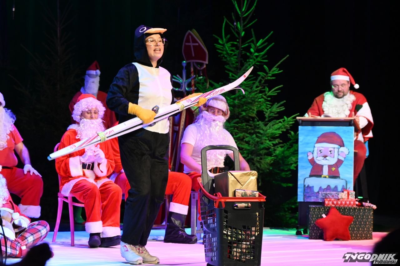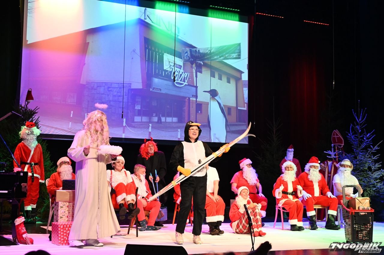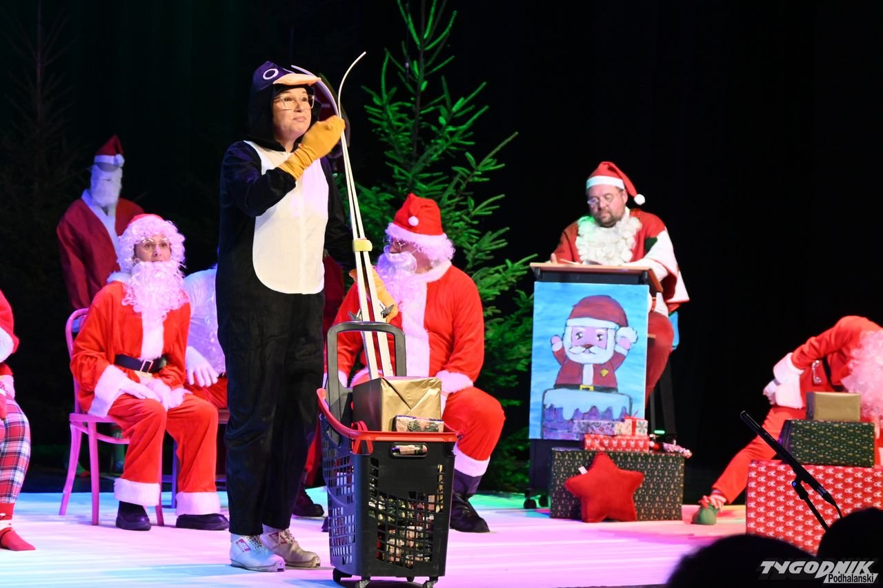 W blisko godzinnym przedstawieniu widz - ten młodszy, ale i ten starszy - dostał porcję dobrego humoru, z wartościowymi dialogami. Mikołaje odbywają naradę, kto ma gdzie iść z prezentami. Padają nazwy nowotarski osiedli i znanych miejsc: Bereki, Niwa, Polana Szaflarska, Bór na Czerwonem. Wyświetlana też jest mapa miasta. Wszystko się nieco komplikuje, bo do Mikołajów dołącza... pingwin, który wylądował przed chwilą na nowotarskim lotnisku i też chce dołączyć do "paczki" czerwonych postaci rozdających prezenty w mieście. Ostatecznie otrzymuje zgodę. Mikołajom z pomocą przychodzi też anioł i diabeł.