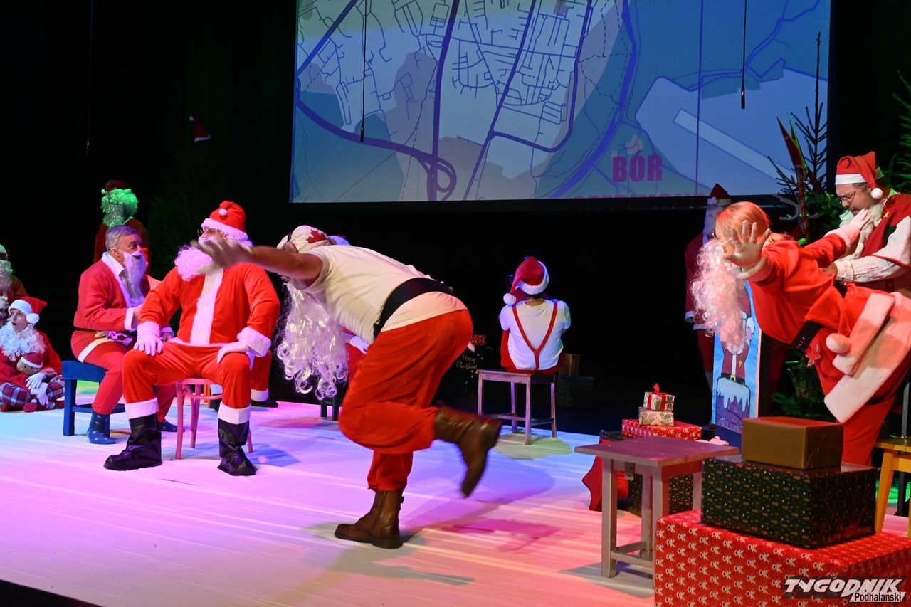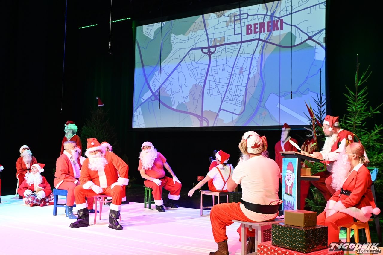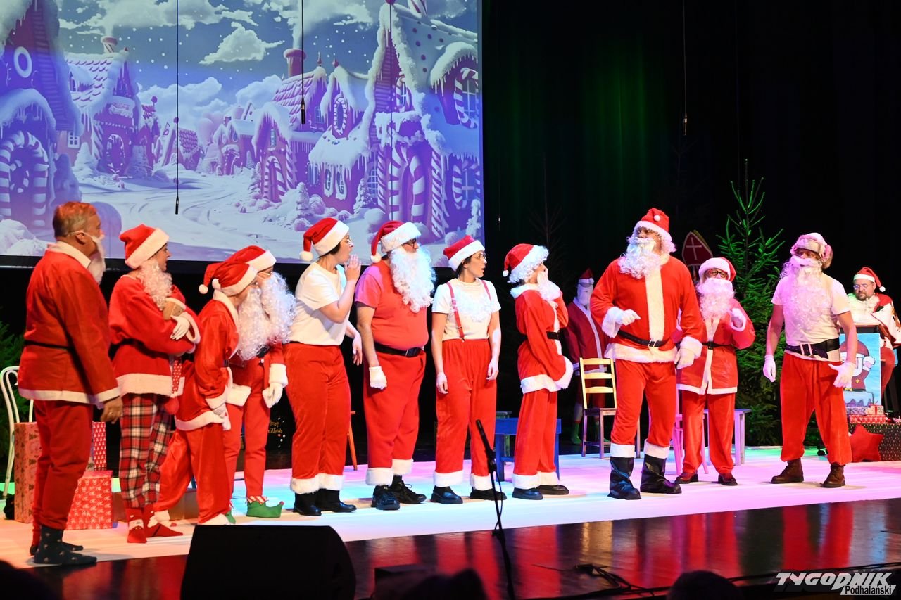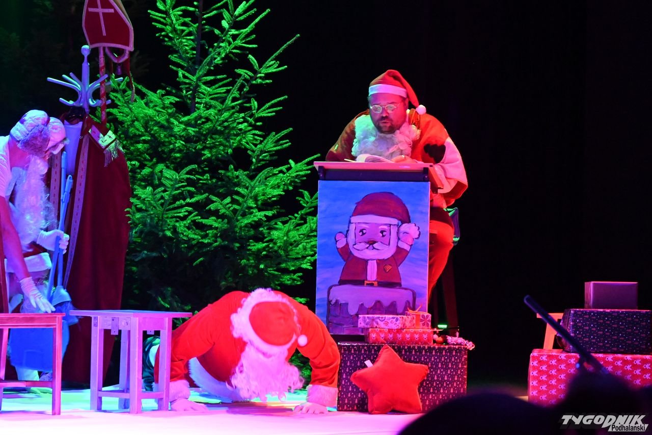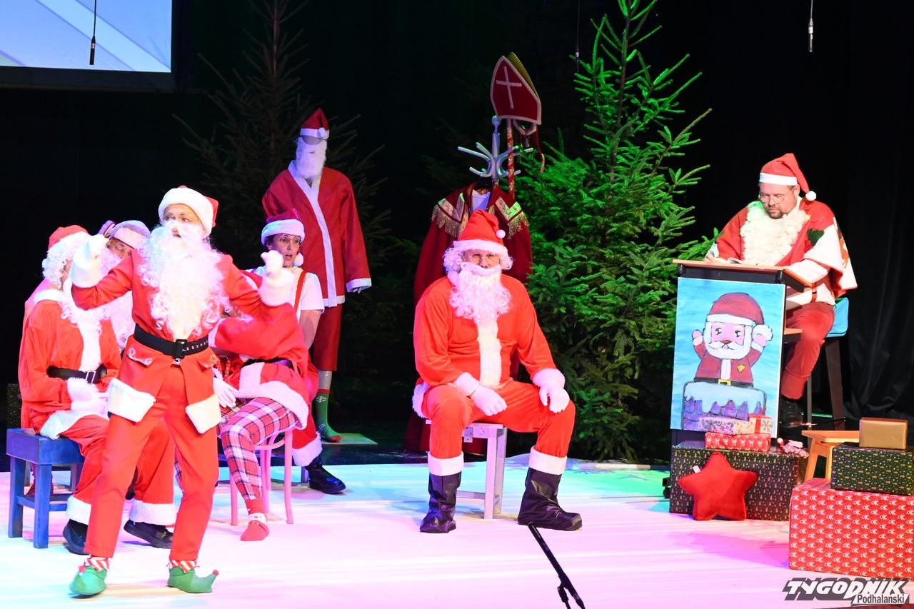 W blisko godzinnym przedstawieniu widz - ten młodszy, ale i ten starszy - dostał porcję dobrego humoru, z wartościowymi dialogami. Mikołaje odbywają naradę, kto ma gdzie iść z prezentami. Padają nazwy nowotarski osiedli i znanych miejsc: Bereki, Niwa, Polana Szaflarska, Bór na Czerwonem. Wyświetlana też jest mapa miasta. Wszystko się nieco komplikuje, bo do Mikołajów dołącza... pingwin, który wylądował przed chwilą na nowotarskim lotnisku i też chce dołączyć do "paczki" czerwonych postaci rozdających prezenty w mieście. Ostatecznie otrzymuje zgodę. Mikołajom z pomocą przychodzi też anioł i diabeł.