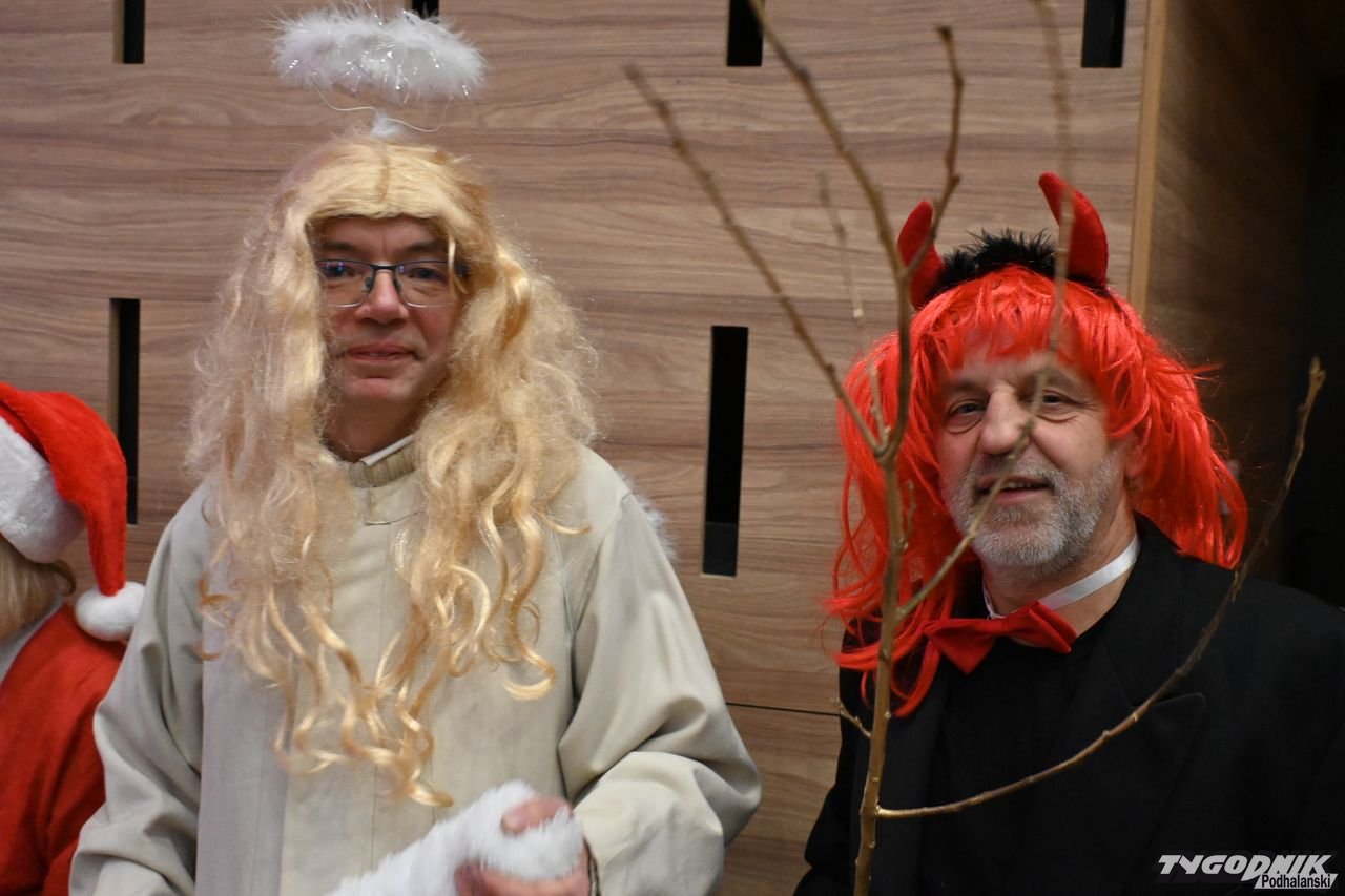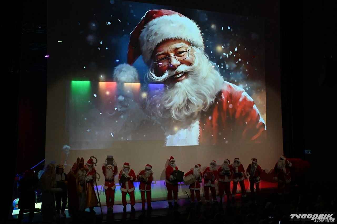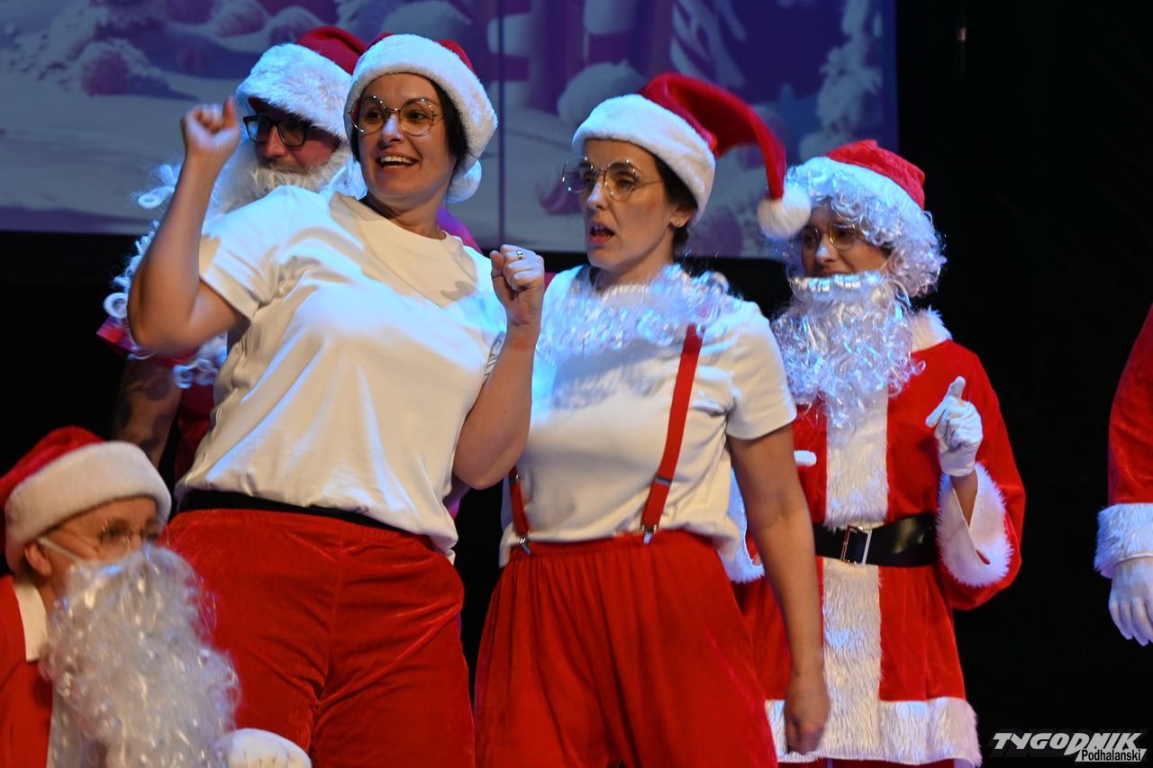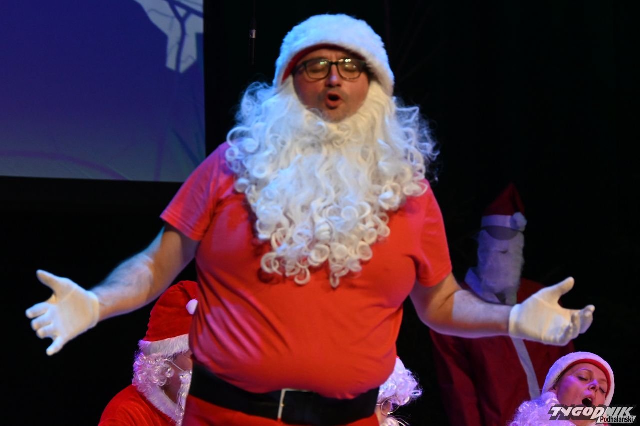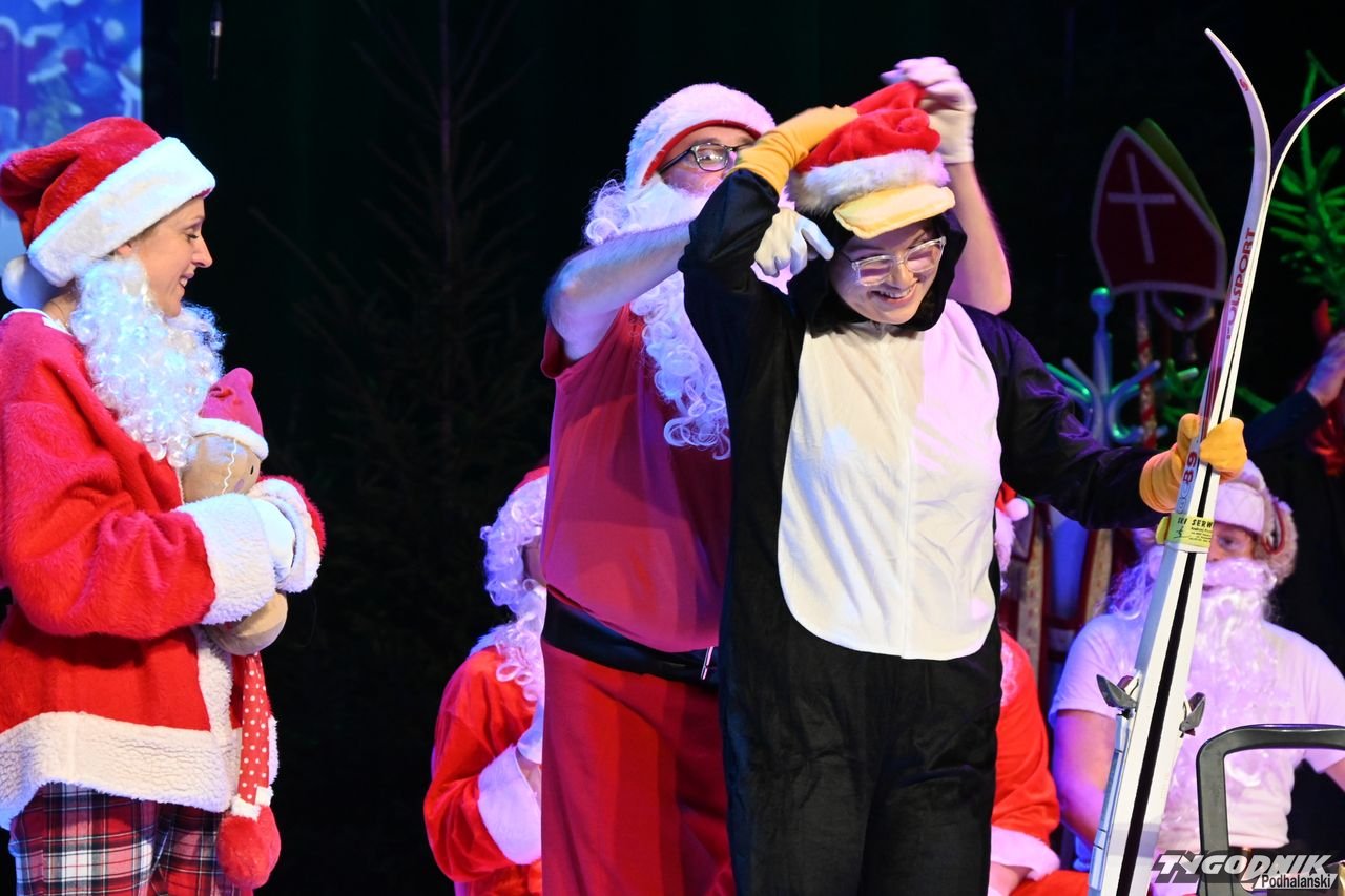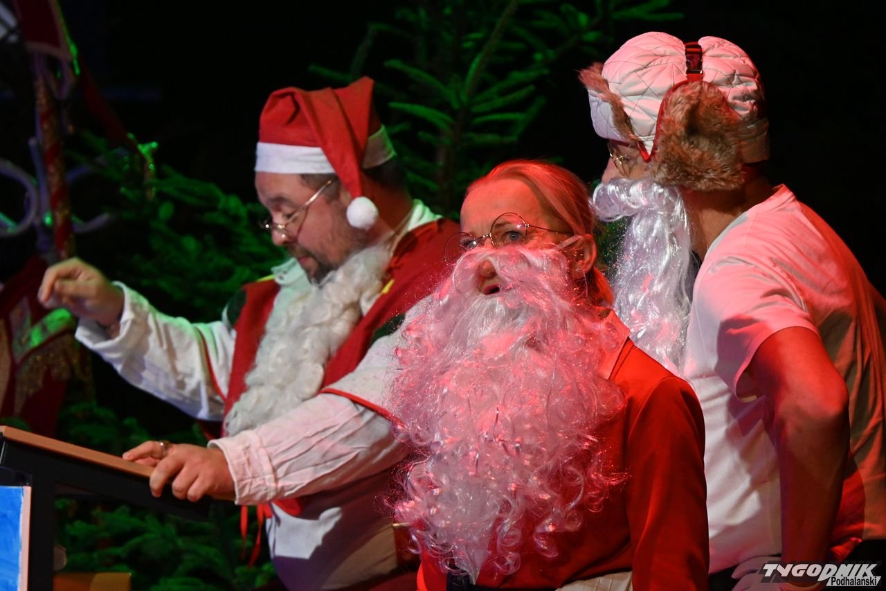 W blisko godzinnym przedstawieniu widz - ten młodszy, ale i ten starszy - dostał porcję dobrego humoru, z wartościowymi dialogami. Mikołaje odbywają naradę, kto ma gdzie iść z prezentami. Padają nazwy nowotarski osiedli i znanych miejsc: Bereki, Niwa, Polana Szaflarska, Bór na Czerwonem. Wyświetlana też jest mapa miasta. Wszystko się nieco komplikuje, bo do Mikołajów dołącza... pingwin, który wylądował przed chwilą na nowotarskim lotnisku i też chce dołączyć do "paczki" czerwonych postaci rozdających prezenty w mieście. Ostatecznie otrzymuje zgodę. Mikołajom z pomocą przychodzi też anioł i diabeł.