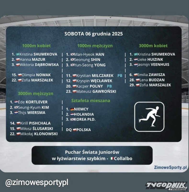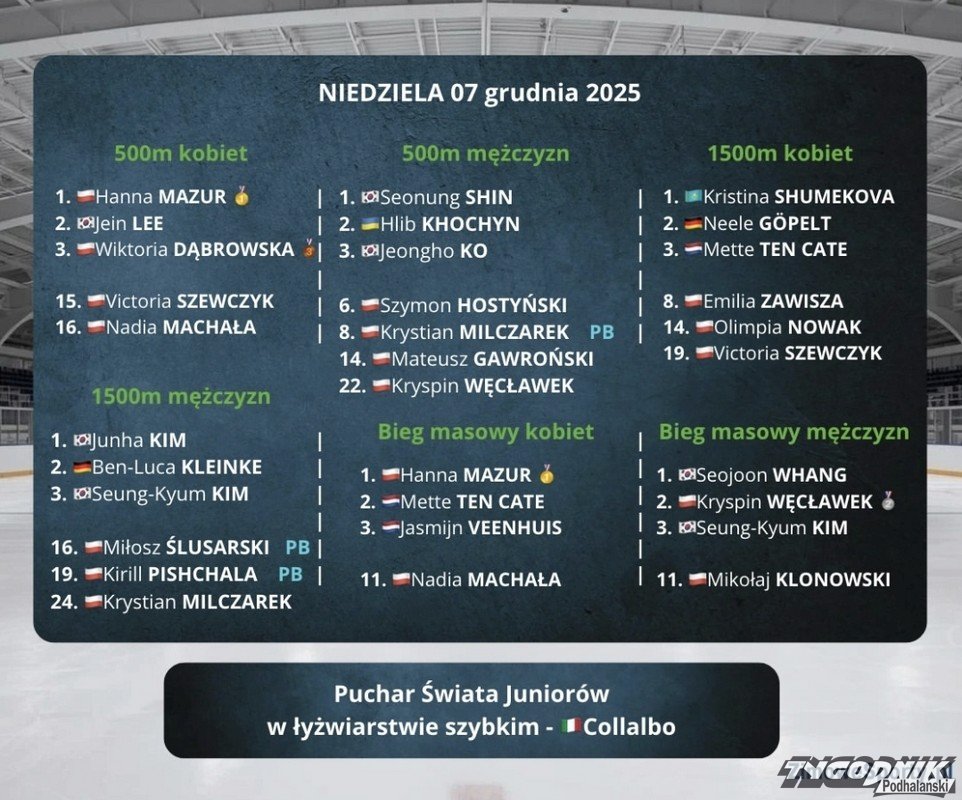 We włoskim Collalbo zakończyła się druga odsłona Pucharu Świata Juniorów w łyżwiarstwie szybkim. Polscy zawodnicy zaprezentowali się znakomicie, zdobywając łącznie sześć medali i zajmując wyższe lokaty niż przed tygodniem w Mediolanie. Bardzo dobrze wypadli również reprezentanci SMS Zakopane, którzy odnotowali wyraźny progres i kolejne rekordy życiowe.