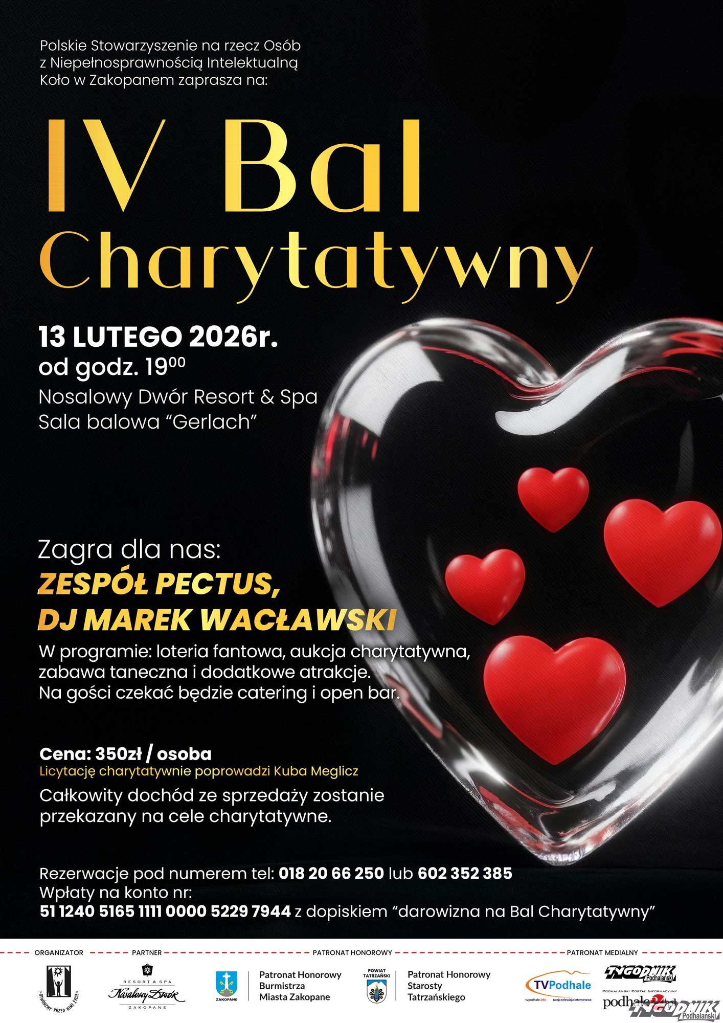 Polskie Stowarzyszenie Osób z Niepełnosprawnością Intelektualną Koło w Zakopanem organizuje IV Bal Charytatywny, który odbędzie się w piątek, 13 lutego 2026 roku o godzinie 19.00 w Nosalowy Dwór Resort & Spa.