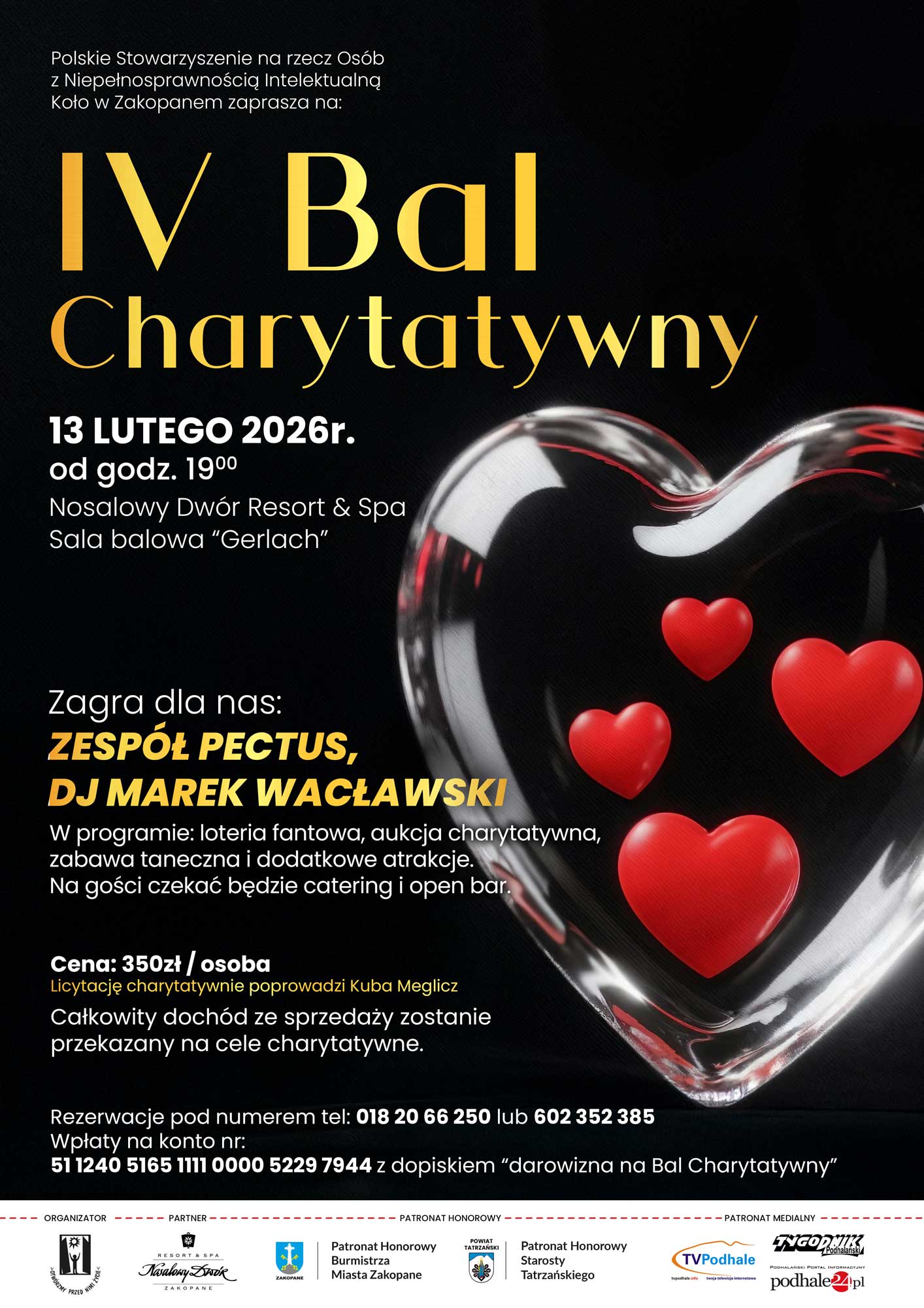 Polskie Stowarzyszenie Osób z Niepełnosprawnością Intelektualną Koło w Zakopanem organizuje IV Bal Charytatywny, który odbędzie się w sobotę, 13 lutego 2026 roku o godzinie 19.00 w Nosalowy Dwór Resort & Spa.
