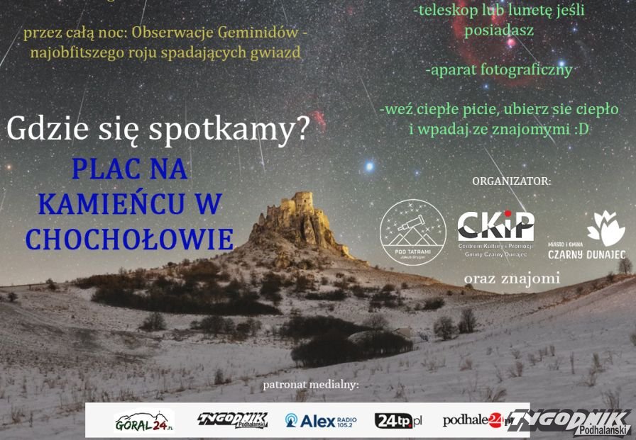 Do wspólnej ich obserwacji Jakub Grygiel zaprasza na Plac na Kamieńcu w Chochołowie, wespół z CKiP Gminy Czarny Dunajec, Miastem i Gminą Czarny Dunajec oraz znajomymi. Zbiórka o godzinie 18. Na początku oglądać będziecie Jowisza i Saturna wraz z ich księżycami, zimową część Drogi Mlecznej, mgławice, gromady i galaktyki. Nauczycie się też rozpoznawać zimowe gwiazdozbiory. Przez całą noc zaś będziecie wypatrywać Geminidów. Jeśli pogoda dopisze, możecie spodziewać się niezwykle widowiskowych przelotów.