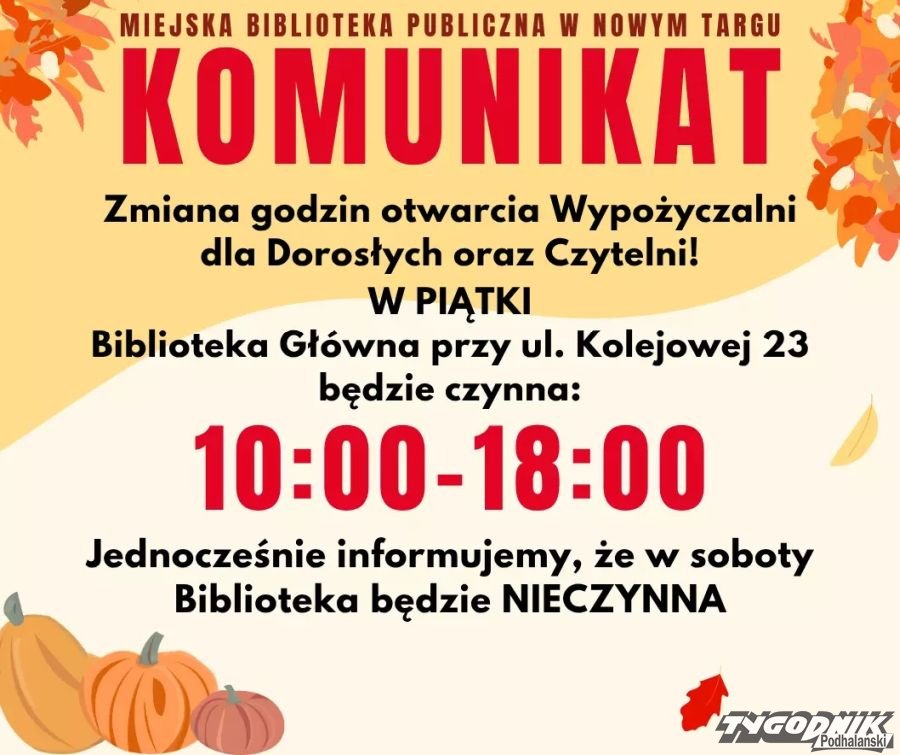Miejska Biblioteka Publiczna w Nowym Targu informuje, że od października br. zmieniła godziny otwarcia Czytelni i Wypożyczalni przy ul. Kolejowej 23.