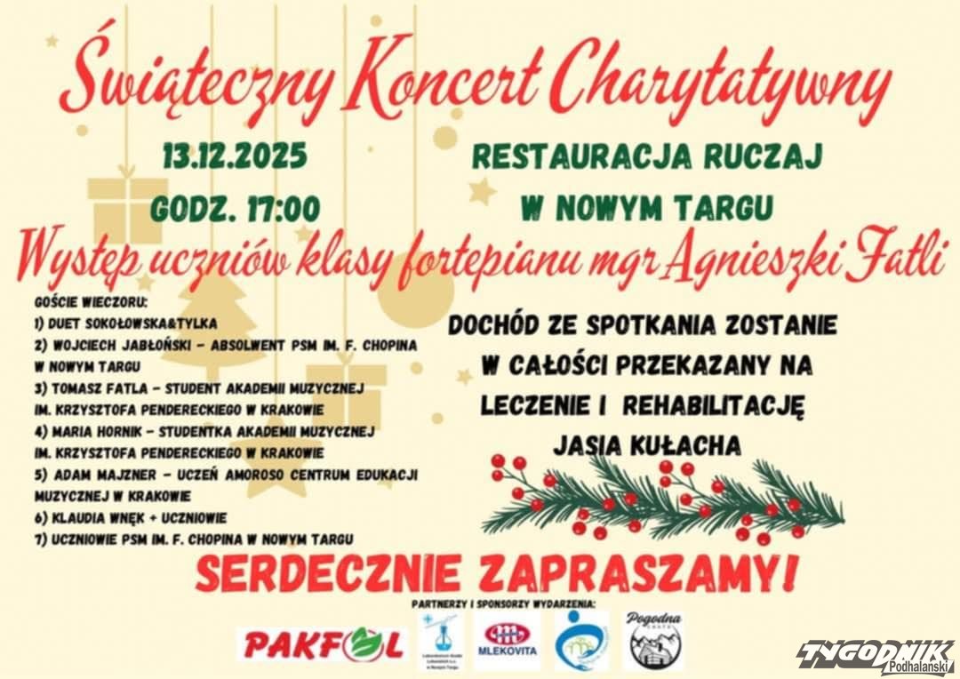 W sobotę 13.12 w Restauracji Ruczaj w Nowym Targu odbędzie się Świąteczny Koncert Charytatywny.
