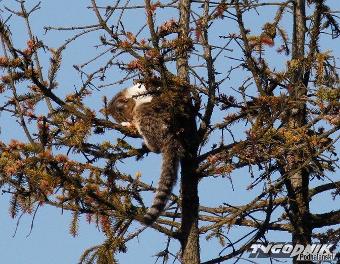 Kot, który utknął na drzewie w Nowym Targu - już bezpieczny