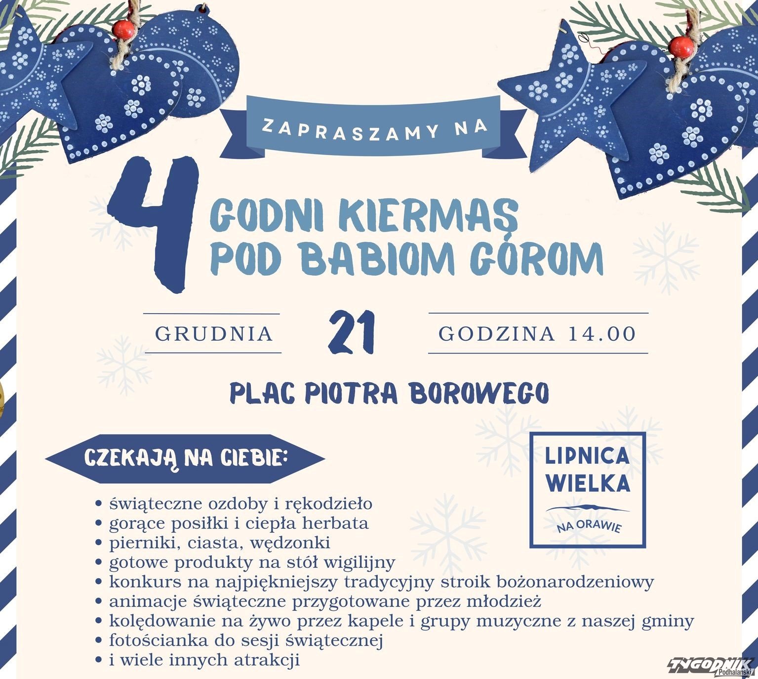 21 grudnia na Placu Piotra Borowego od godz. 14 odbędzie się 4. Godni Kiermas pod Babiom Górom.