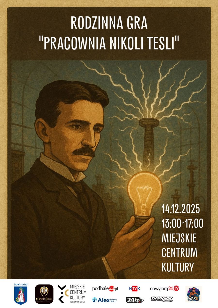 Co to jest „Pracownia Nikoli Tesli”? To rozbudowana gra przygodowa przeznaczona dla drużyn 2- do 5-osobowych, w tym dla rodzin z dziećmi od 6. roku życia. Gra jest w pełni bezpłatna i odbywa się całkowicie w budynku Miejskiego Centrum Kultury w Nowym Targu, co czyni ją idealną propozycją na zimowy weekend.
