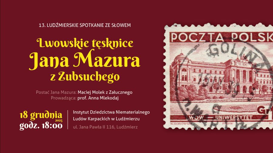 W ramach cyklu "Ludźmierskie Spotkania ze Słowem" Małopolskie Centrum Kultury SOKÓŁ w Nowym Sączu oraz Związek Podhalan Oddział w Ludźmierzu serdecznie zapraszają na spotkanie poetyckie pt. "Lwowskie tęsknice Jana Mazura z Zubsuchego". Wydarzenie odbędzie się w czwartek 18.12 o godz. 18 w Domu Podhalańskim - Instytucie Dziedzictwa Niematerialnego Ludów Karpackich w Ludźmierzu.