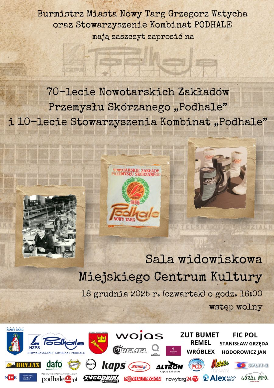 W czwartek 18.12 zapraszamy do Sali Widowiskowej Miejskiego Centrum Kultury w Nowym Targu na 70-lecie NZPS "Podhale" i 10-lecie Stowarzyszenia Kombinat Podhale.