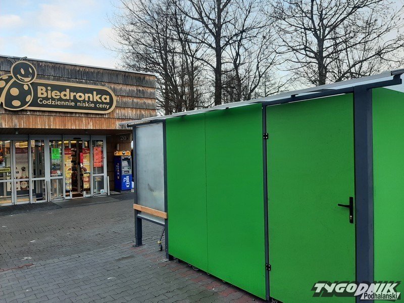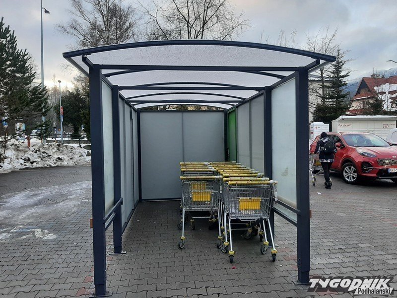 Przed sklepami sieci Biedronka w Zakopanem pojawiły się zadaszone budki, które wzbudzają zainteresowanie mieszkańców i turystów, niektórzy pod wiaty odstawiali wózki.