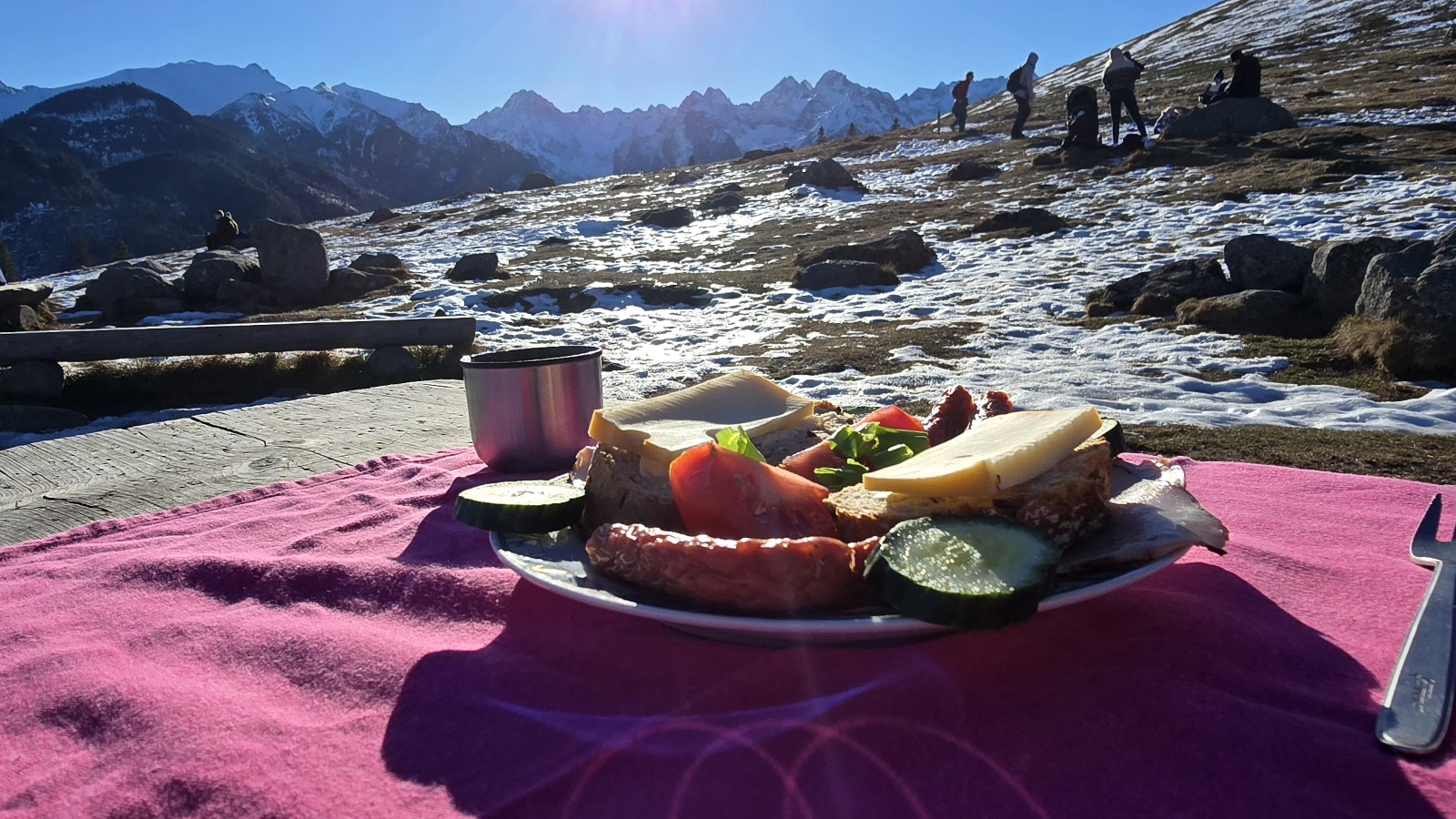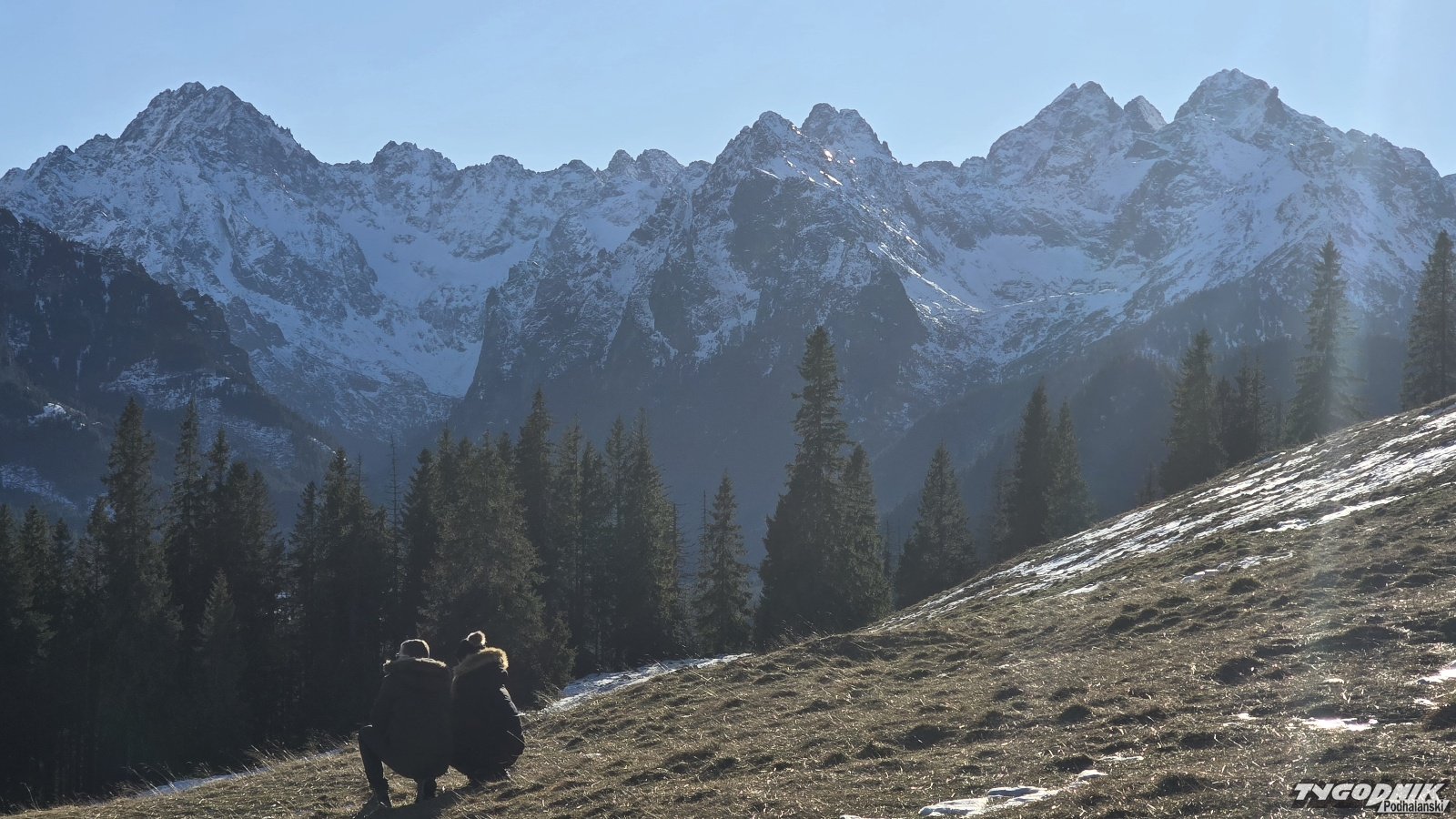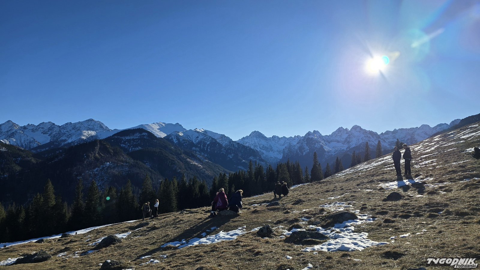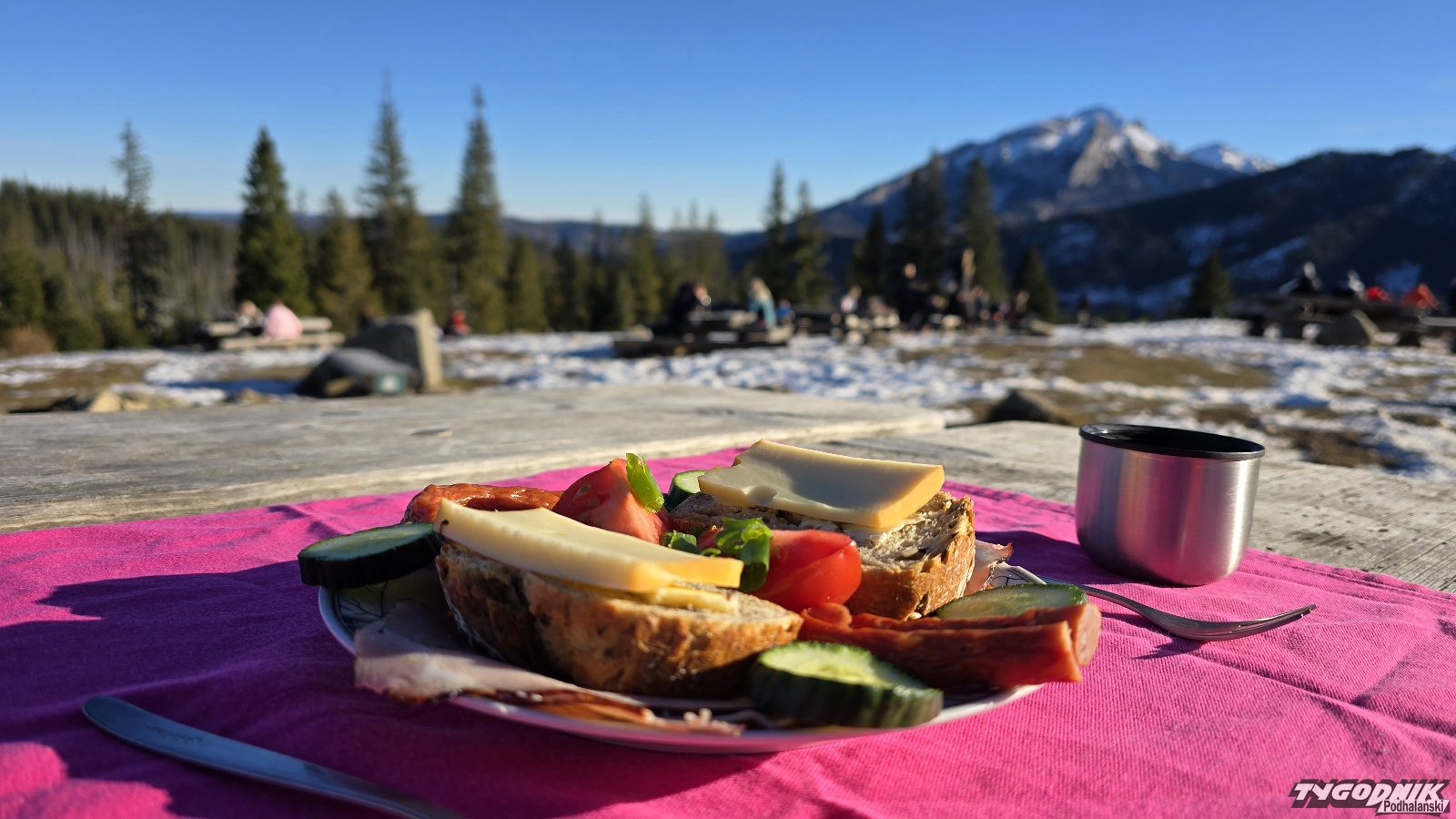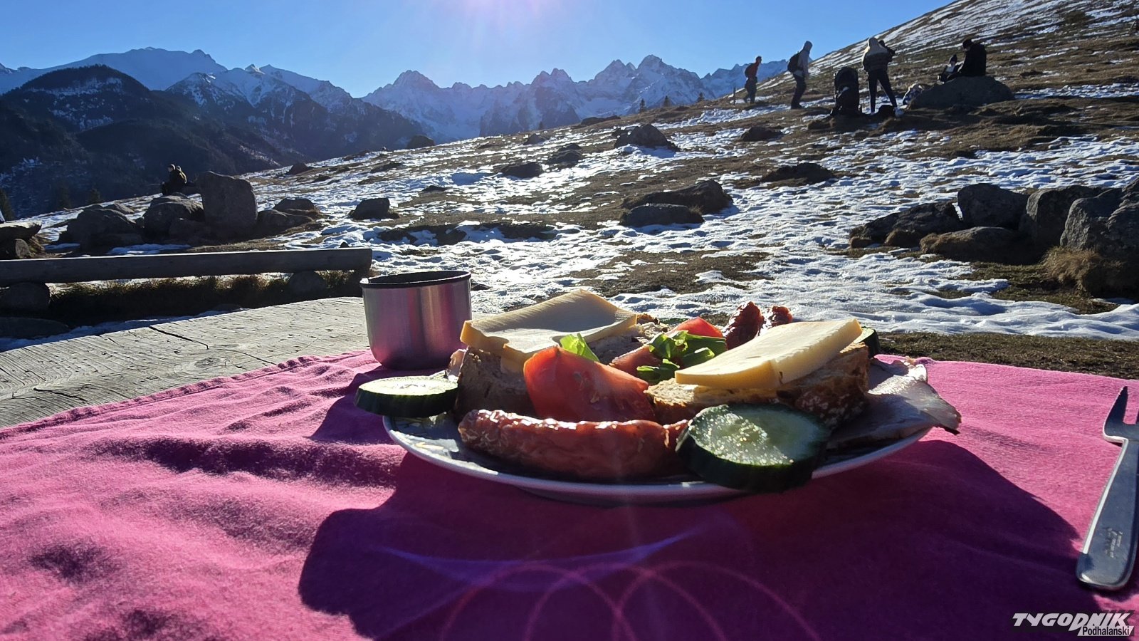 Co prawda na szlaku z Zazadniej przeważa cień, temperatura rano lekko poniżej zera, to gdy wyjdzie się na Rusinową Polanę wkraczamy jakby do innej słonecznej i cieplejszej rzeczywistości. Dziś na Rusinową wybrało się wielu turystów. Niebieskie niebo, słońce, przecudowne widoki sprawiają, że śniadanie wśród takich krajobrazów smakuje podwójnie.