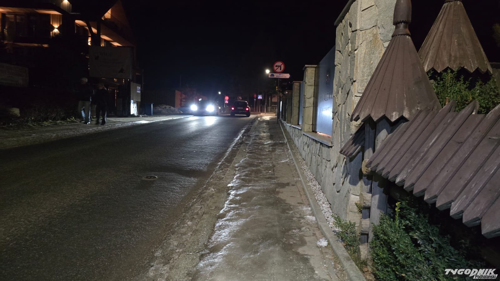Na ul. Broniewskiego w Zakopanem chodniki przy rezydencjach i apartamentach są w wielu miejscach pokryte starym lodem. Śliska nawierzchnia na długim odcinku ulicy, niemal do Drogi na Olczę, stwarza realne zagrożenie dla bezpieczeństwa pieszych.