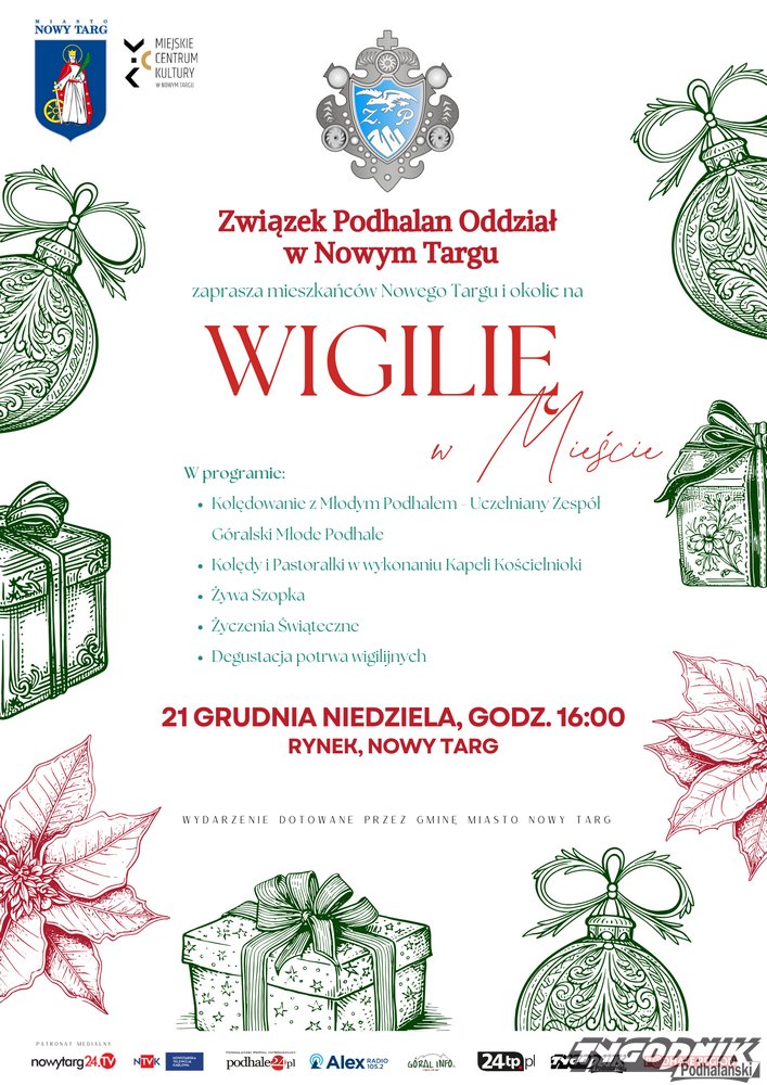 Związek Podhalan Oddział w Nowym Targu zaprasza mieszkańców oraz gości na tradycyjne spotkanie wigilijne pod hasłem "Wigilia w Mieście", które odbędzie się w niedzielę 21 grudnia o godz. 16.00 na Rynku w Nowym Targu.