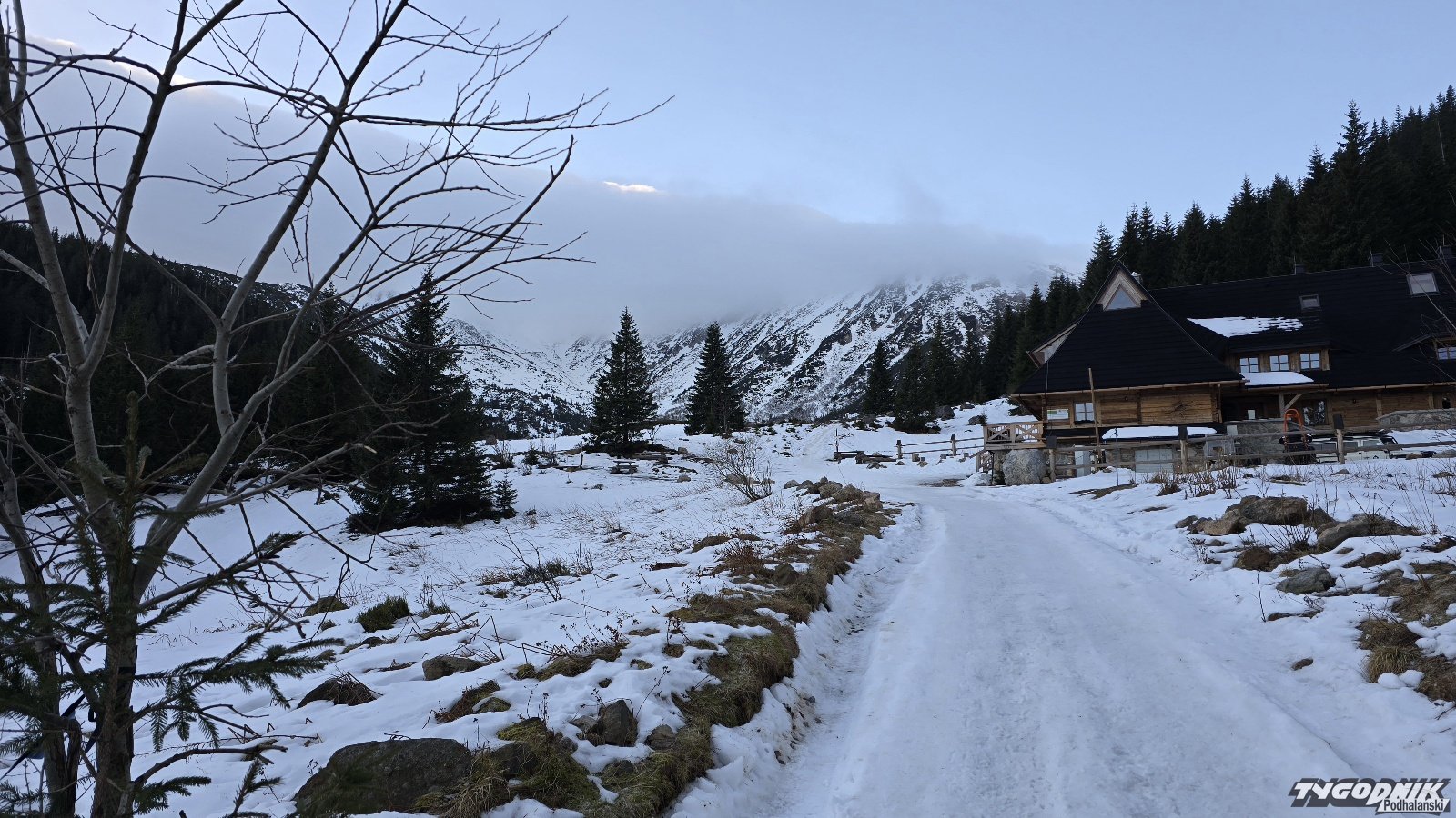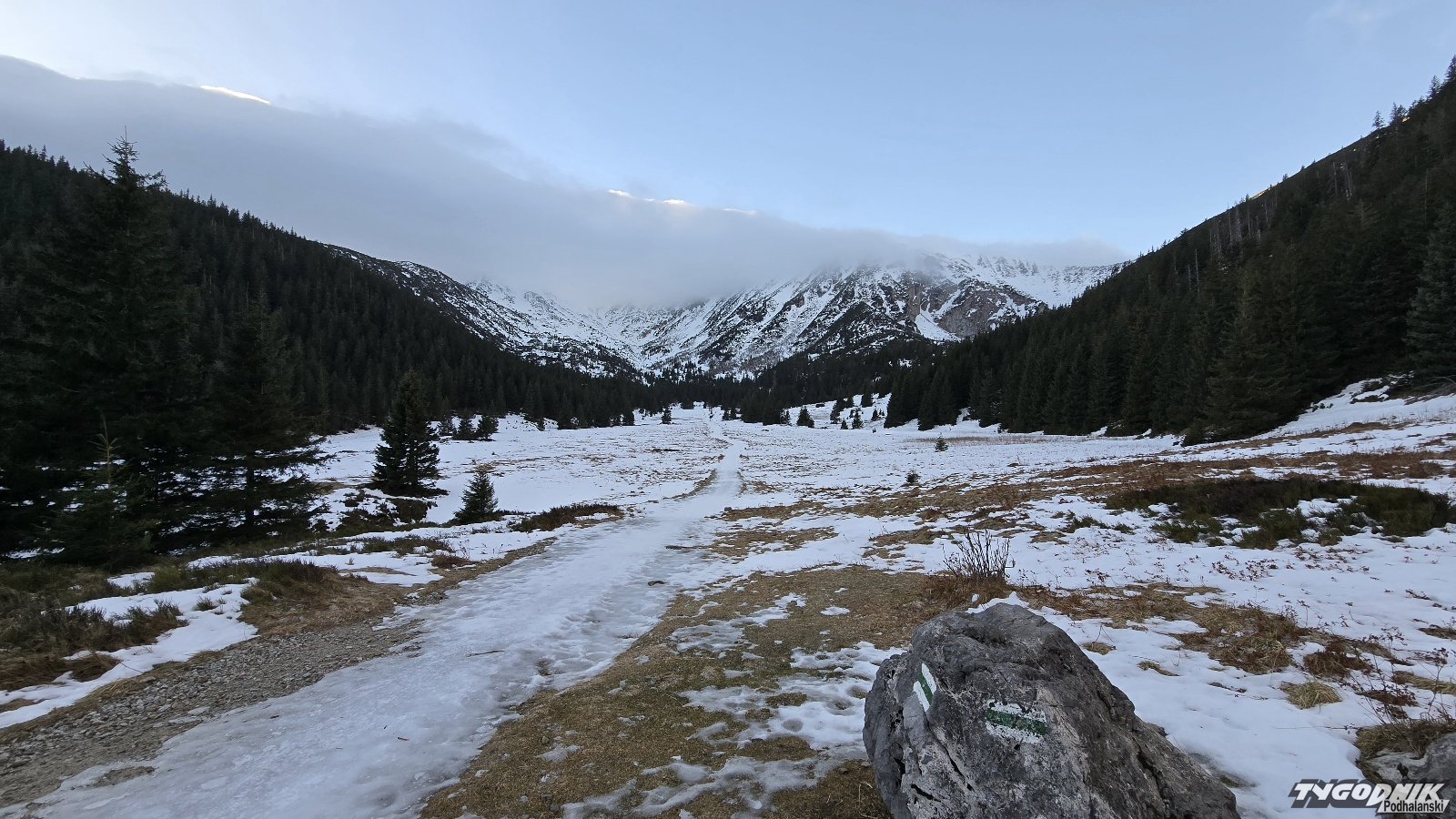 Podmuchy halnego są odczuwalne dopiero w Kuźnicach. Nad Czerwonymi Wierchami wał z chmur. Wiatr nie jest bardzo mocny, na razie do 55 km na godz. na Kasprowym. Szlak na Halę Kondratową miejscami zupełnie bez śniegu, ale w górnej części zalega lód i zmrożony śnieg. Wyżej bardzo trudne warunki, tylko dla doświadczonych turystów potrafiących posługiwać się zimowym sprzętem.