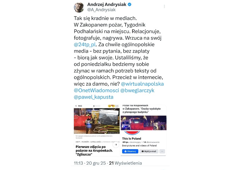 Nasze materiały wideo z wczorajszego pożaru na Krupówkach miał ponad 4,2 mln wyświetleń. Niektóre media, także te ogólnopolskie postanowiły bez zgody opublikować nasze materiały.