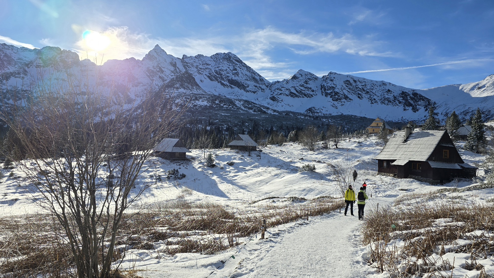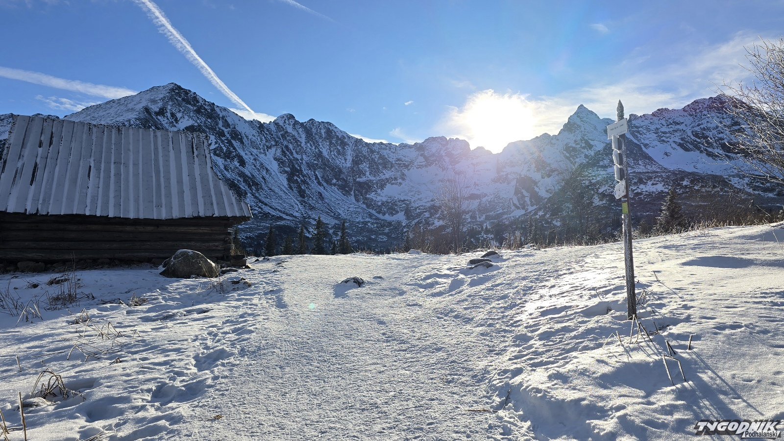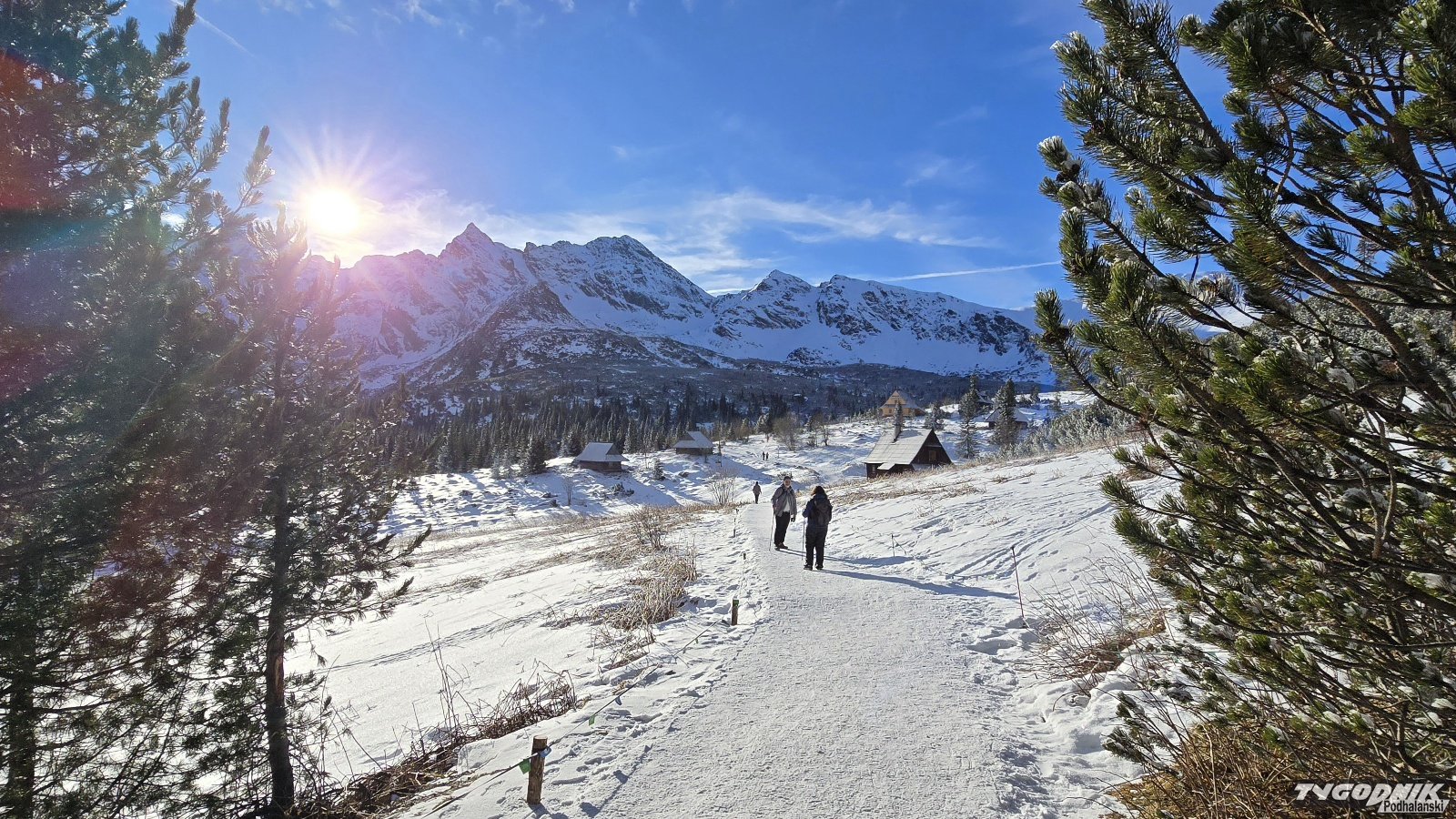 Rano w górach świeciło słońce. Na Hali Gąsienicowej pierwsze promienie słoneczne - o tej porze roku - pojawiają się dopiero po godz. 9. Dziś rano na szlaku nie było wielu turystów, ci wyruszyli na tatrzańskie trasy nieco później. Sobota zapowiada się słonecznie, temperatura w Zakopanem przekroczy 0 st. C. W Tatrach zacznie rosnąć prędkość wiatru. Niedziela z mrozem, opadami śniegu i porywami wiatru, które w Tatrach mogą przekraczać 130 km na godz.