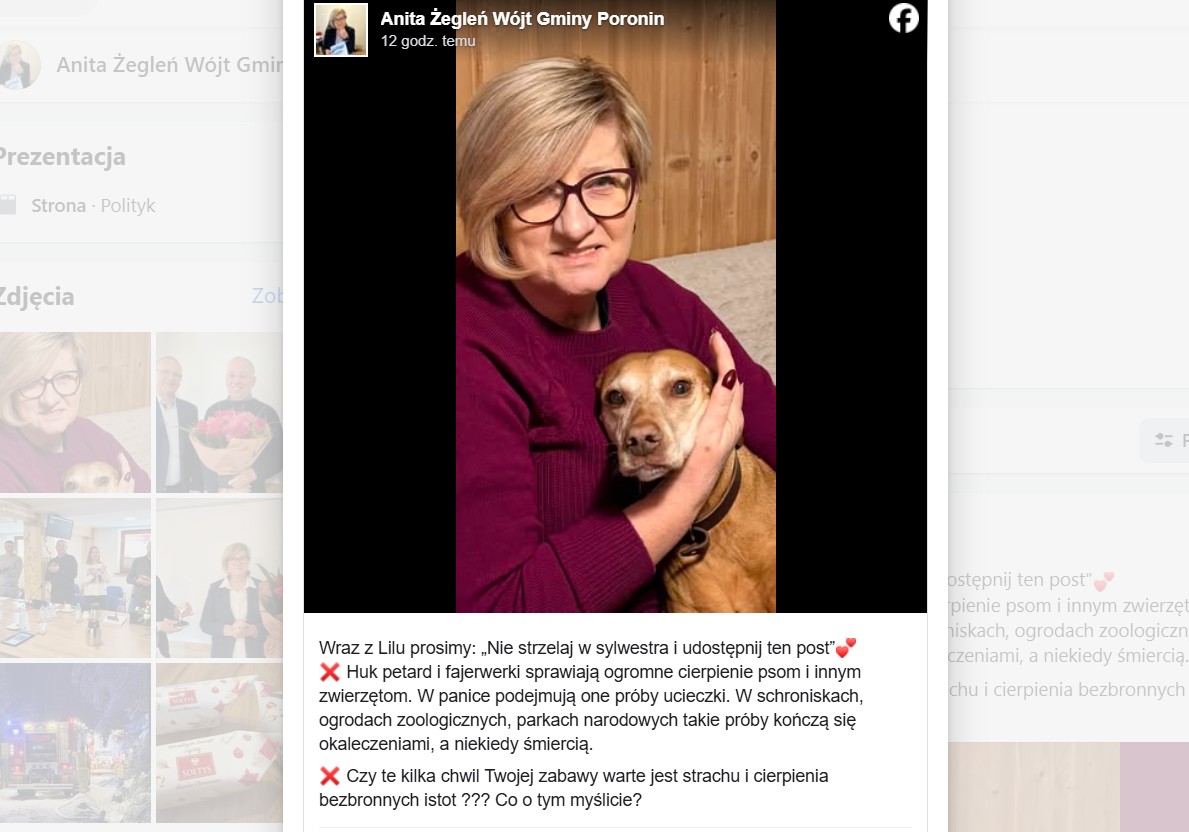 Wójt Poronina Anita Żegleń wraz ze swoją suczką Lilu apeluje do mieszkańców o rezygnację z petard i fajerwerków w noc sylwestrową. Jak podkreśla, huk wystrzałów to dla zwierząt ogromne cierpienie, które często kończy się tragedią.