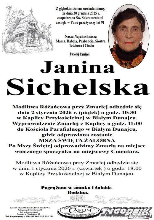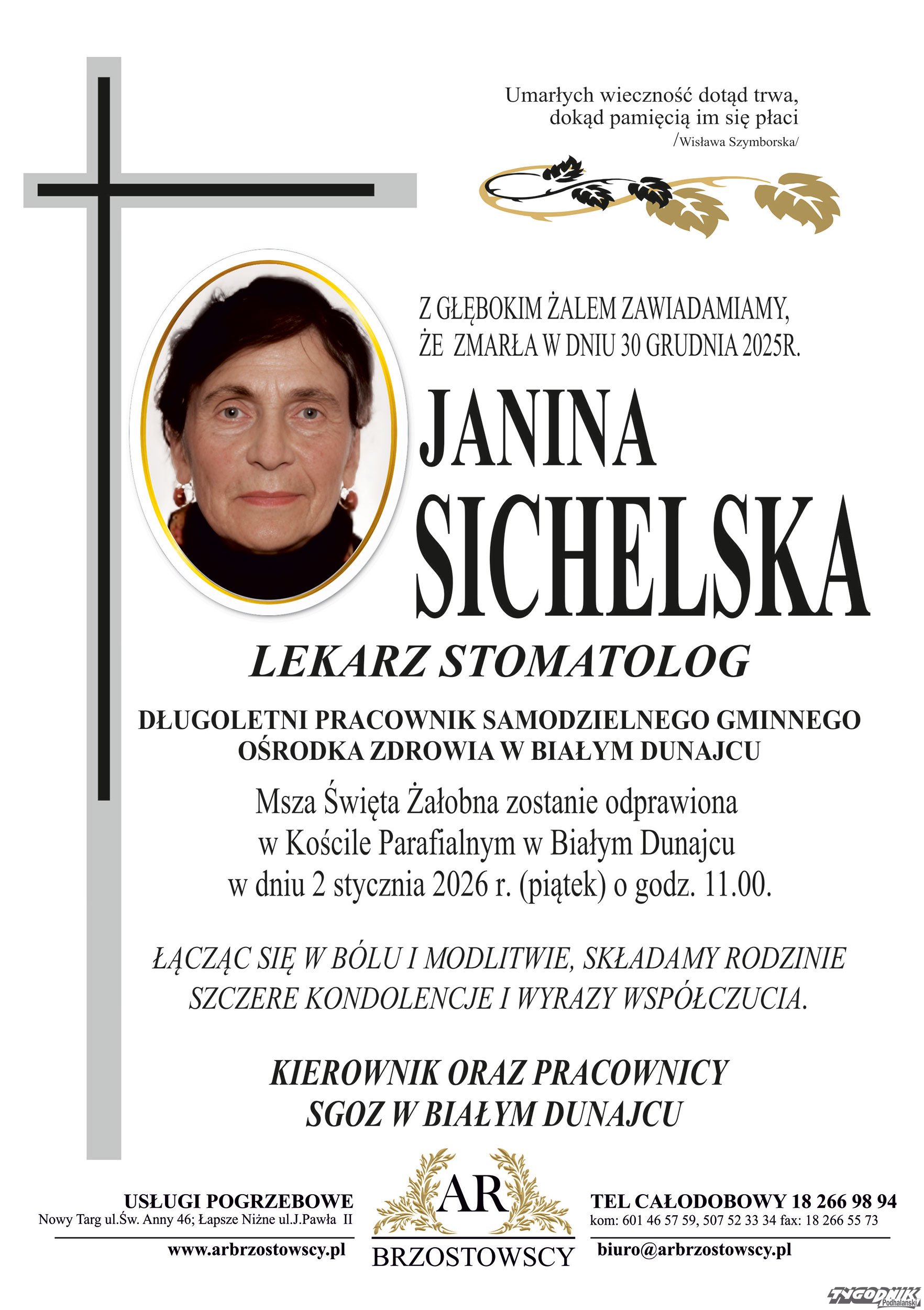 Janina Rzadkosz-Sichelska była stomatologiem, prowadziła zespół im. Andrzeja Skupnia Florka. Zmarła 30 grudnia. Miała 91 lat. Uroczystości pogrzebowe odbędą się 2 stycznia w Białym Dunajcu.
