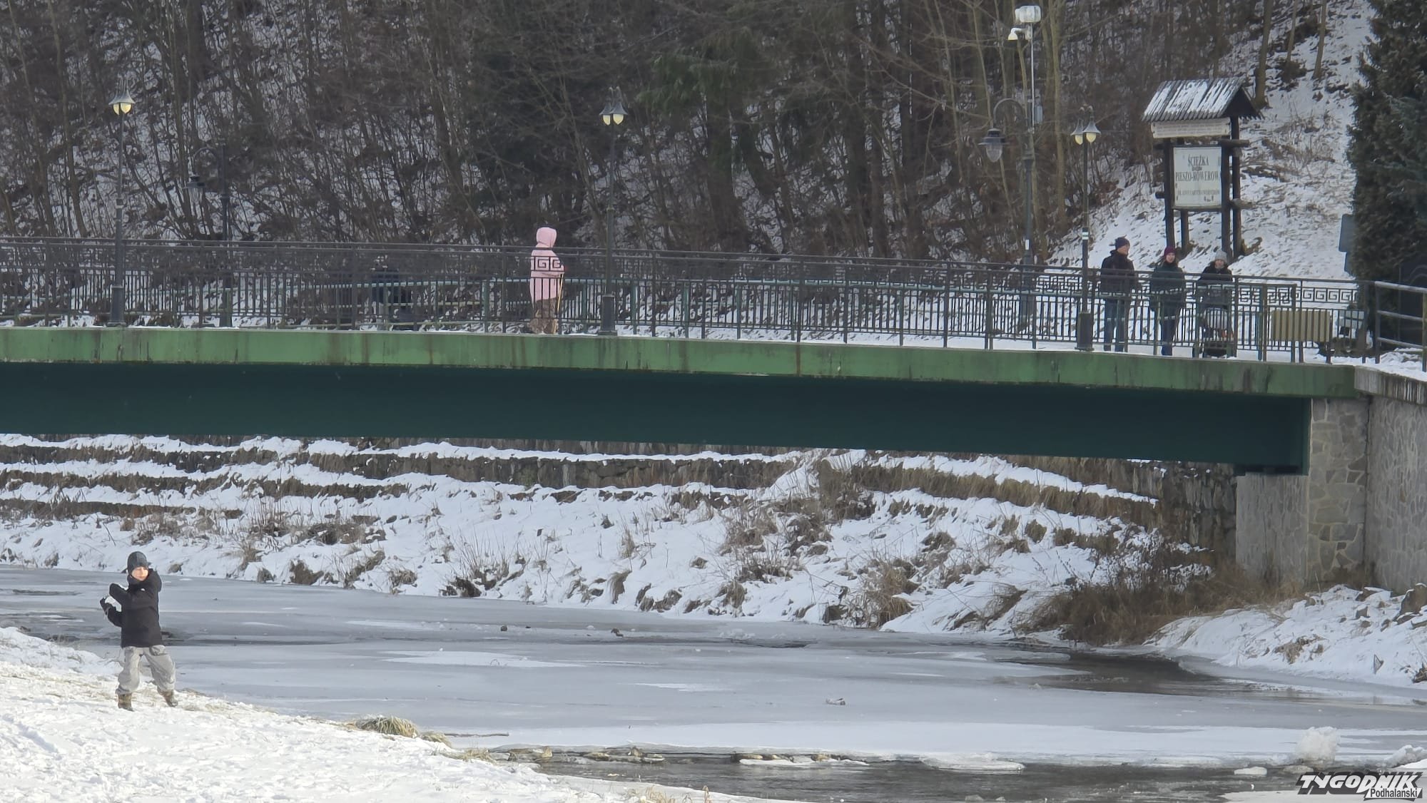 Grajcarek w Szczawnicy skuty lodem. Słońce i mróz przyciągają nielicznych turystów (WIDEO)