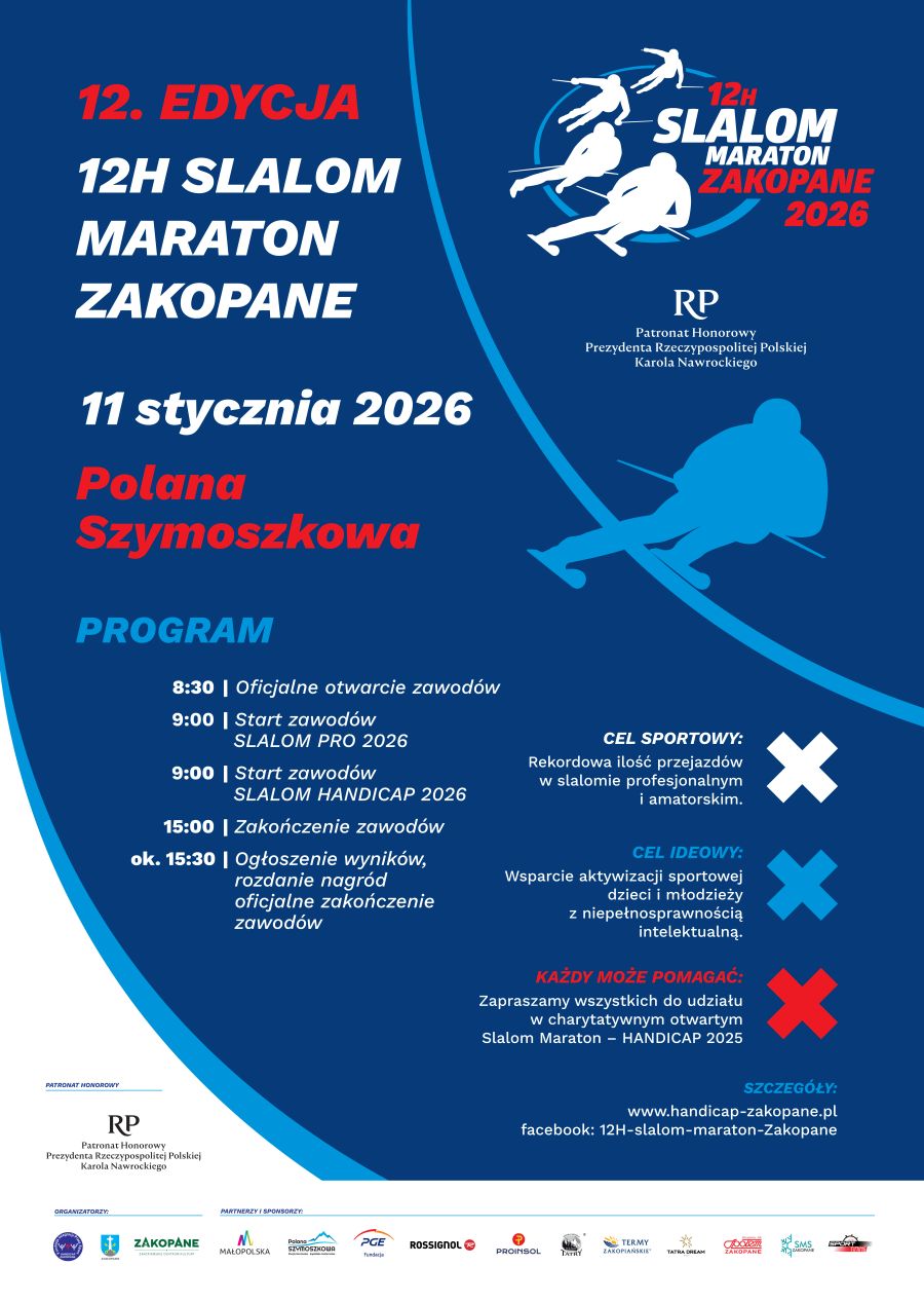 12. edycja 12H Slalom Maraton Zakopane odbędzie się w niedzielę 11.01 na Polanie Szymoszkowej. Wydarzenie, organizowane od 2015 roku, po raz kolejny połączy sportową rywalizację z ideą wspierania aktywizacji sportowej osób z niepełnosprawnościami.