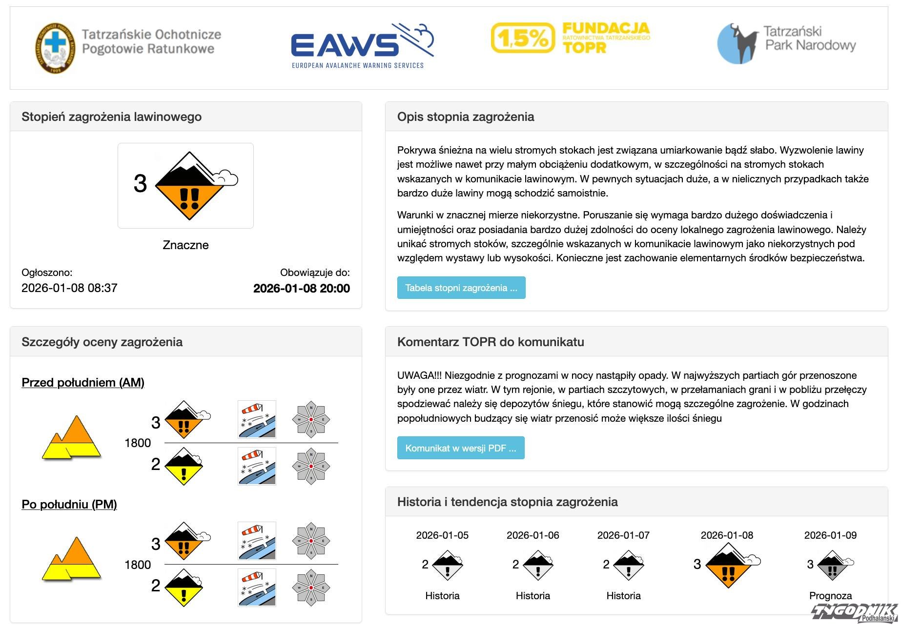 Warunki w znacznej mierze niekorzystne. Poruszanie się wymaga bardzo dużego doświadczenia i umiejętności oraz posiadania bardzo dużej zdolności do oceny lokalnego zagrożenia lawinowego. Należy unikać stromych stoków, szczególnie wskazanych w komunikacie lawinowym jako niekorzystnych pod względem wystawy lub wysokości. Konieczne jest zachowanie elementarnych środków bezpieczeństwa.
