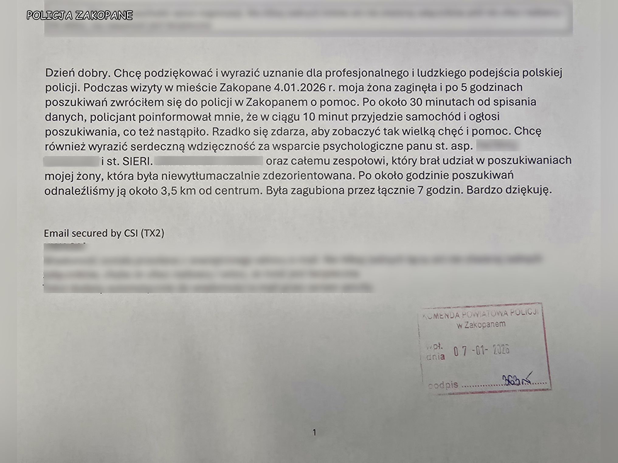 Do zakopiańskiej Policji dotarły podziękowania za profesjonalną pomoc i wsparcie psychologiczne podczas poszukiwań jego małżonki.