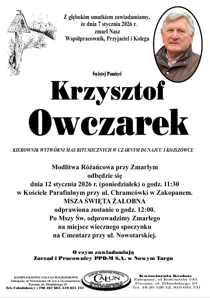 2026-01-09 11:27 Na co zwrócić uwagę przy wyborze klimatyzatora do domu? 2026-01-09 11:00 Pensjonariusze rabczańskiego DPS będa podróżować nowym busem 2026-01-09 10:00 Pasażerska trzynastka 1 2026-01-09 09:00 Za nami mroźna noc. Piątek zaczął się od okienka pogodowego 2026-01-09 08:00 Nowy quad dla druhów ze Sromowiec Niżnych 1 2026-01-08 22:03 A wiecie, że Baciary świętują już 23 lata istnienia? (WIDEO) 6 2026-01-08 21:36 Blisko 300 młodych biegaczy rywalizowało w Klikuszowej (ZDJĘCIA) 2026-01-08 21:00 Prawie pół miliona aut przejechało w okresie świąt tunelem na zakopiance 2 2026-01-08 20:27 Zmiany w komunikacji miejskiej w czasie Pucharu Świata 2026-01-08 20:03 Zabójca Pershinga wyszedł na wolność 1 2026-01-08 19:31 Pierwsza trasa dla narciarzy biegowych gotowa 2 2026-01-08 19:00 Kolej na rozliczenia 2 2026-01-08 18:29 Góry śniegu zasłaniają wyjazd na skrzyżowaniu 4 2026-01-08 18:17 Ostrzeżenie przed silnym mrozem 2026-01-08 18:01 DUŃSKA MARKA CHANGE LINGERIE JUŻ NA PODHALU. Nowa jakość bielizny w Nowym Targu i Zakopanem 2026-01-08 18:00 Polacy będą mieli łatwiej na Wielkiej Krokwi. Japończycy, Austriacy i Niemcy bez liderów w Zakopanem 2026-01-08 17:00 Prezydent Karol Nawrocki przyjedzie na skoki i na Slalom Maraton? 11 2026-01-08 16:00 Zakopane i Szczawnica nominowane w plebiscycie Zimowych Gwiazd Travelist 2026 1 2026-01-08 15:30 Slalom gigant na stoku Stacji Narciarskiej Harenda 2026-01-08 15:00 Na drodze do Morskiego Oka i zakopiance posypały się mandaty dla pieszych 1 2026-01-08 14:30 Slalom Maraton dla profesjonalnych narciarzy i amatorów 2026-01-08 14:00 Rabka w statystykach Urzędu Stanu Cywilnego 1 2026-01-08 14:00 12 stycznia ostatnie pożegnanie Krzysztofa Owczarka 2026-01-08 13:04 Dobór znicza do charakteru nagrobka: kolory, kształty i estetyka 2026-01-08 13:03 Zimowa radość na Równi Krupowej 4 2026-01-08 13:03 Turysta dziękuję policjantom za pomoc w odnalezieniu małżonki 1 2026-01-08 12:29 W Zakopanem przybywa śniegu (WIDEO) 2026-01-08 12:00 Drifterzy na lawecie. Policja zatrzymała dowody rejestracyjne i nałożyła wysokie mandaty 2 2026-01-08 11:30 Trudne "Ścieżki życia". Mamy dla Was bilety 2026-01-08 11:00 Niebezpiecznie w Tatrach. TOPR ogłosiło trzeci stopień zagrożenia lawinowego 2026-01-08 10:30 Policja apeluje o ostrożność na drogach podczas trudnych zimowych warunków 2 2026-01-08 10:00 Po tragedii w Białym Dunajcu. Ofiara to 30-40-letni mężczyzna 2026-01-08 09:10 Zderzenie osobówki z dostawczakiem 2026-01-08 09:09 Rozdajemy bilety na skoki 2 2026-01-08 09:00 W kilku przypadkach specjalna brygada usunie śnieg z chodników 11 2026-01-08 07:59 Policjant do bólu 4 2026-01-07 22:00 Piękne krajobrazy na nartostradzie z Goryczkowej (WIDEO) 2026-01-07 21:01 Bachledówka połączona ze Śląskiem (ZDJĘCIA, WIDEO) 1 2026-01-07 20:30 PKL zapraszają do udziału w trzeciej odsłonie programu grantowego 2026-01-07 20:00 Góralka pływacką mistrzynią Polski 2026-01-07 19:00 Krąg dobrych ludzi się powiększa (ZDJĘCIA, WIDEO) 1 2026-01-07 18:00 Włamał się do marketu i ukradł kasetkę fiskalną 3 2026-01-07 17:00 Józef Galica odwołany z kierownictwa Państwowej Straży Pożarnej (WIDEO) 2026-01-07 16:00 Ukradł rejestracje i domagał się pieniędzy za ich zwrot 1 2026-01-07 15:34 Gdy na moment chmury się przerzedziły, mieliśmy halo nad Tatrami 1 2026-01-07 15:00 Całkiem tłoczno na Krupówkach (WIDEO) 2026-01-07 14:00 Rodzinne granie przy stole 2026-01-07 13:30 Dziś wyznawcy obrządku wschodniego obchodzą Boże Narodzenie 7 2026-01-07 12:25 Posiadał znaczną ilość marihuany i mefedronu 2026-01-07 11:31 Nie żyje Krzysztof Owczarek, wieloletni zastępca burmistrza Zakopanego 11