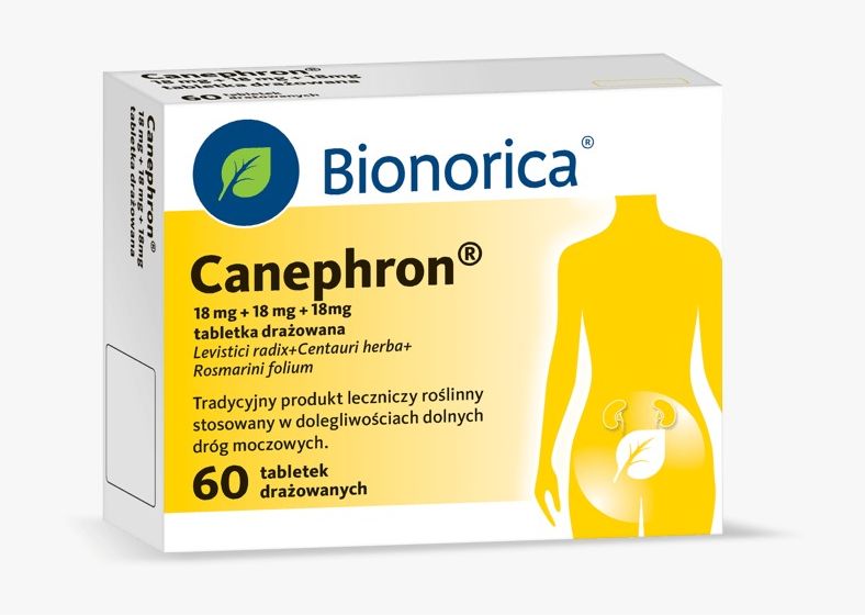 Nazwa produktu leczniczego: Canephron, 18 mg + 18 mg + 18 mg, tabletki drażowane. Jedna tabletka zawiera: korzeń lubczyka, ziele centurii, liście rozmarynu. Postać farmaceutyczna: Tabletka drażowana. Wskazania: Canephron jest tradycyjnym produktem leczniczym roślinnym, stosowanym wspomagająco jako leczenie uzupełniające łagodnie przebiegających chorób zapalnych dróg moczowych oraz zapobiegawczo w osadzaniu się piasku nerkowego. Podmiot odpowiedzialny: Bionorica SE, 92308 Neumarkt, Niemcy. Informacji o leku udziela: Bionorica Polska Sp. z o.o., ul. Hrubieszowska 6B, 01-209 Warszawa.