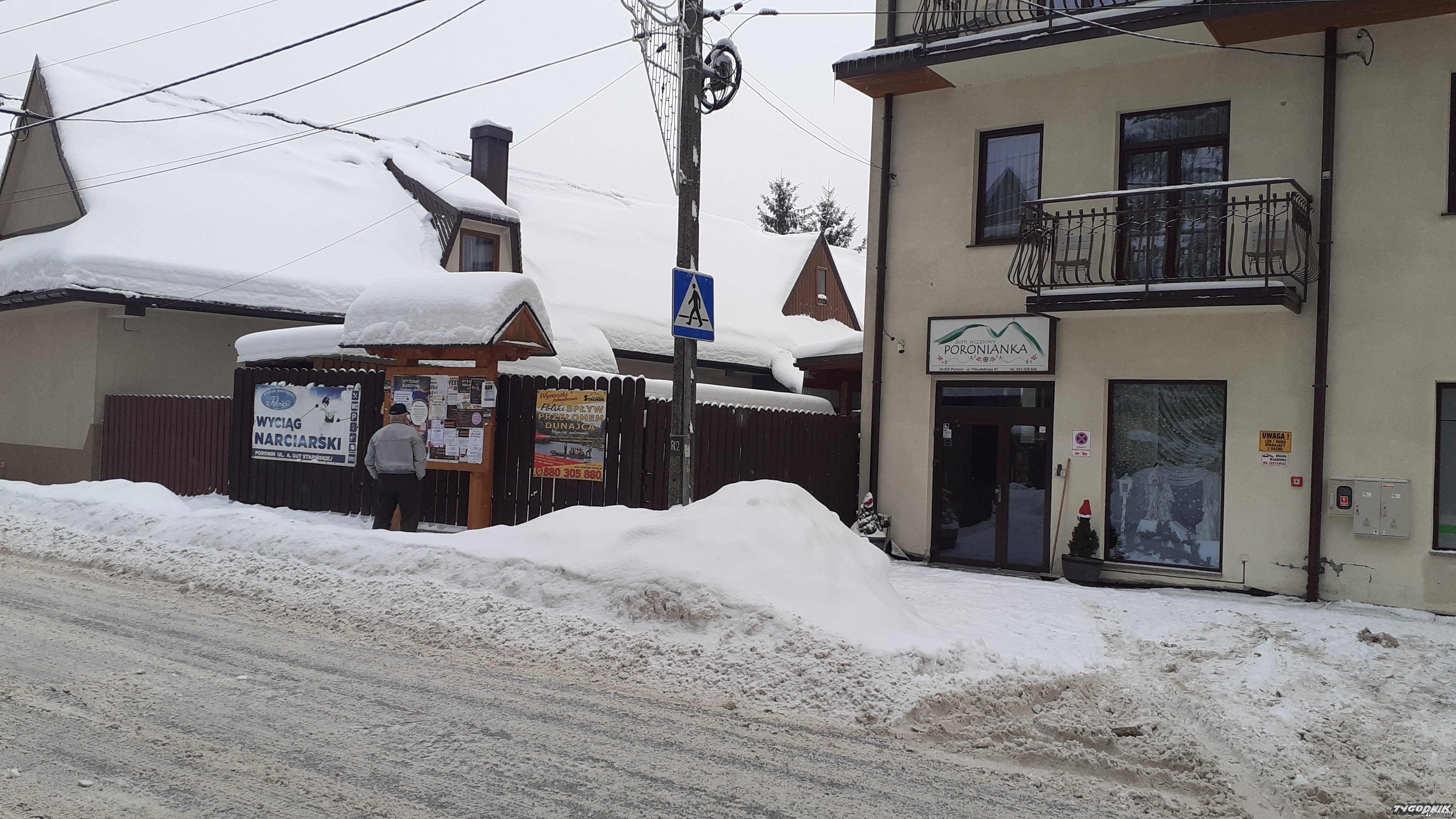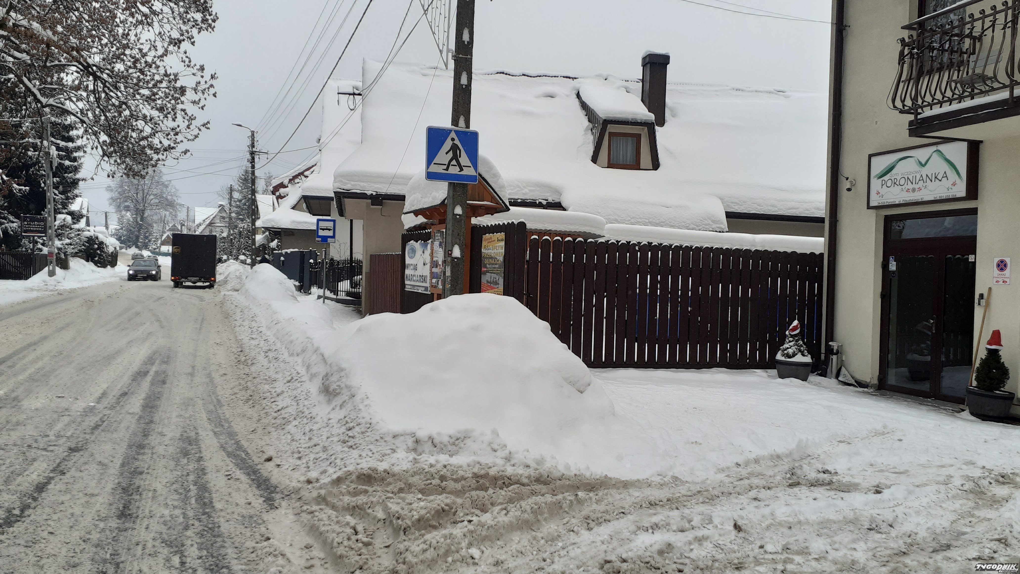 Przejście dla pieszych w centralnym punkcie Poronina zasypane śniegiem.