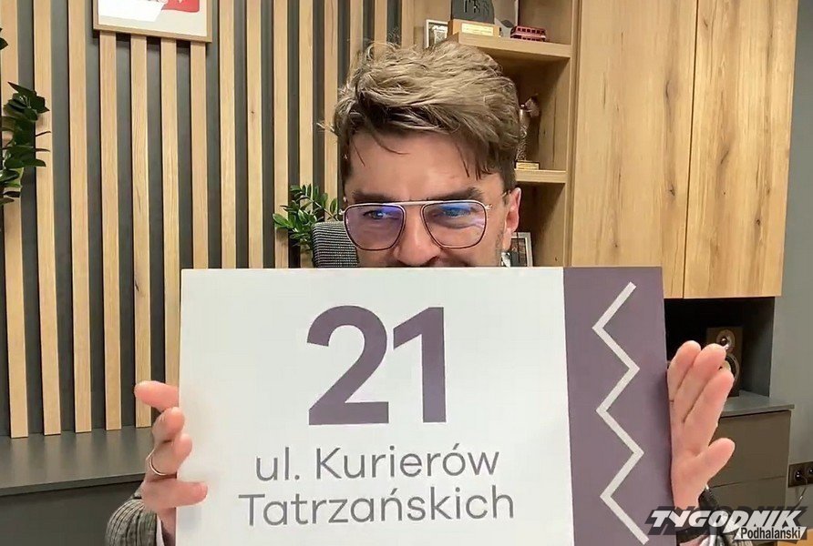 Wójt Roman Krupa prezentuje, jak powinna wyglądać tabliczka z numerem porządkowym montowana na ogrodzeniach i budynkach domów w Gminie Kościelisko.