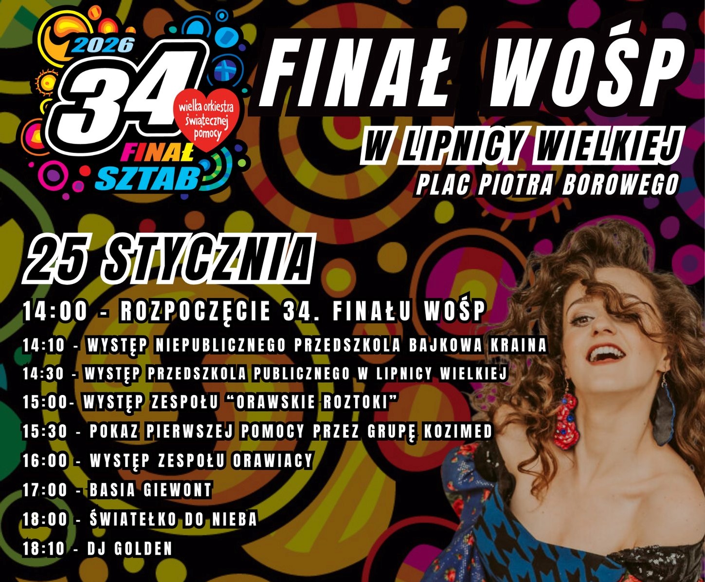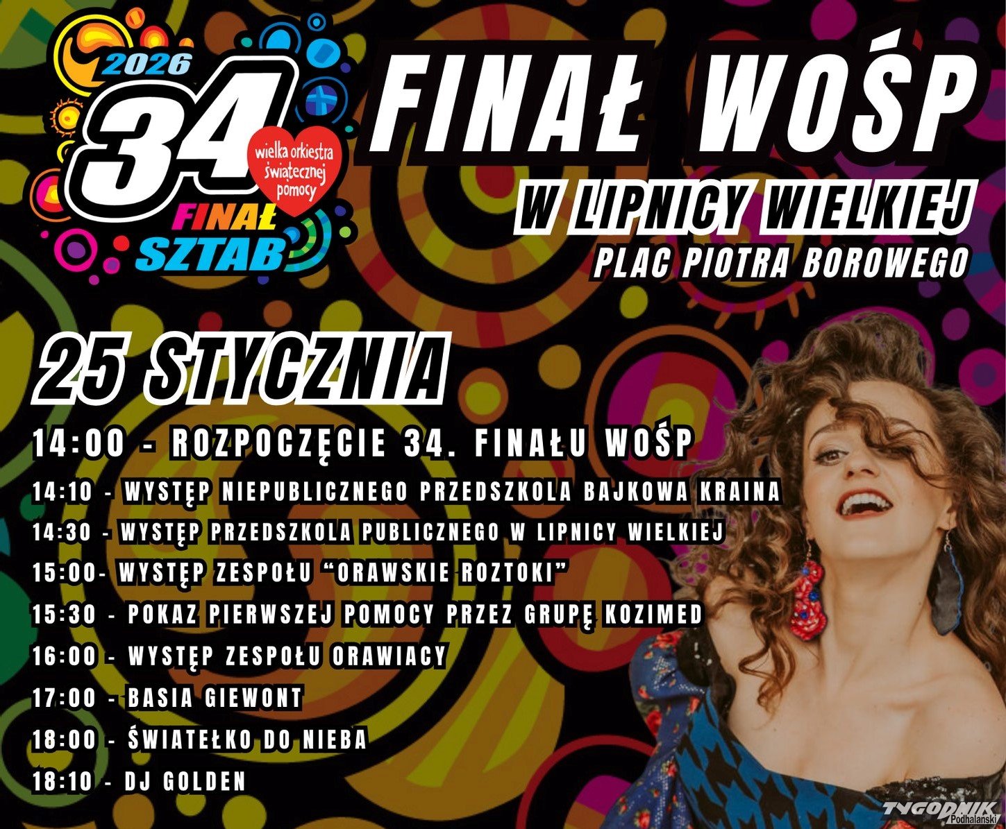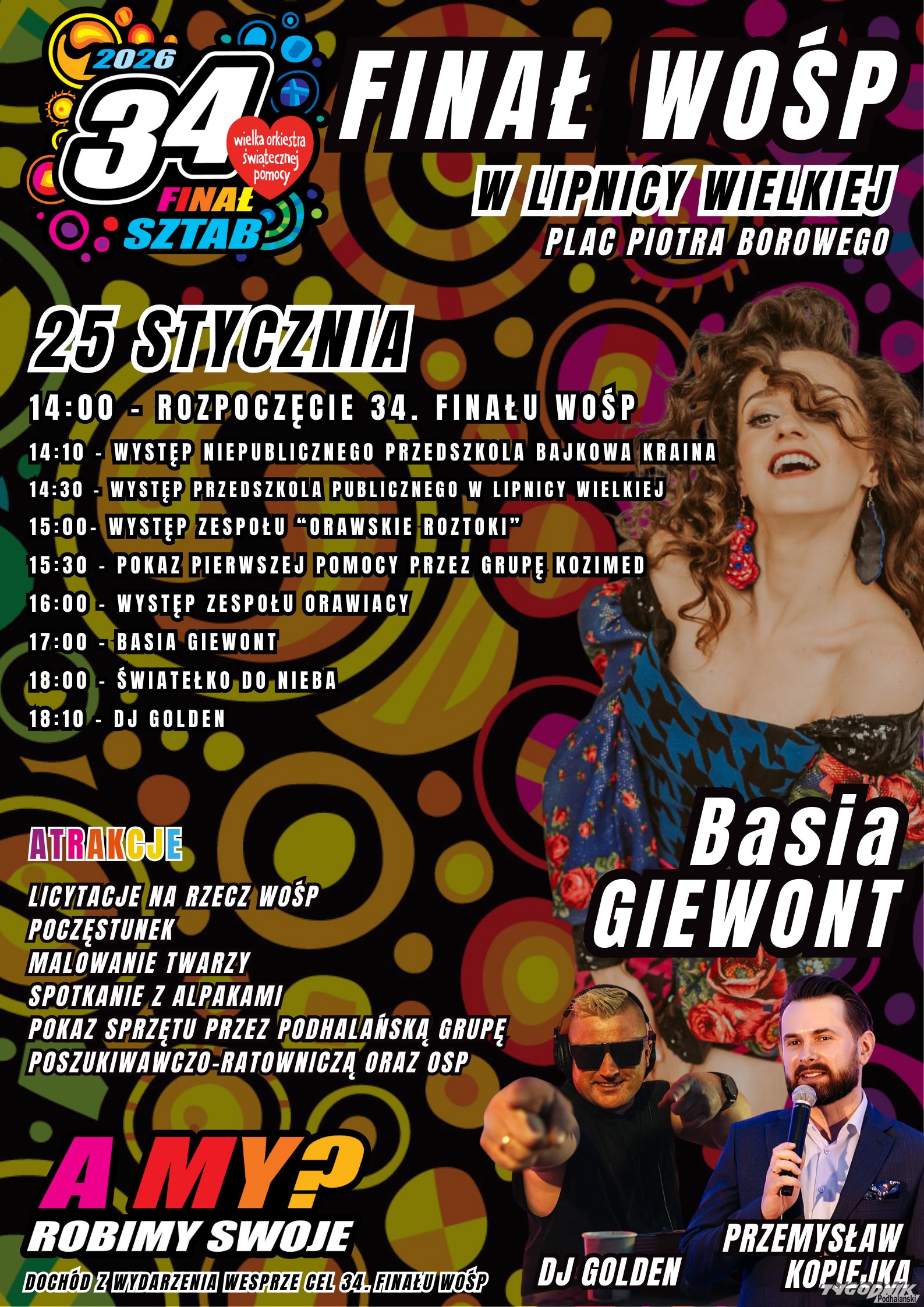 W niedzielę, 25 stycznia na Placu Piotra Borowego w Lipnicy Wielkiej odbędzie się 34. Finał Wielkiej Orkiestry Świątecznej Pomocy. Start zaplanowano na godzinę 14:00.