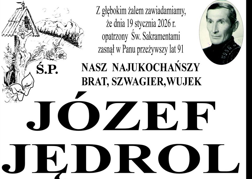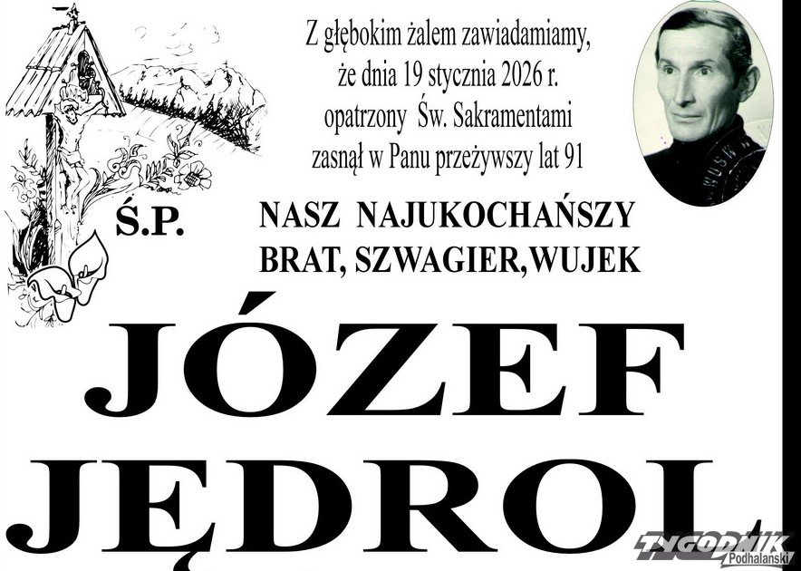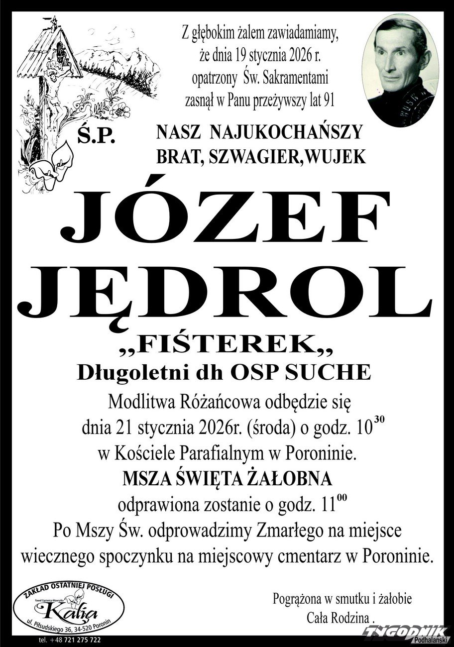 Józef Jędrol miał 91 lat. Zmarł w poniedziałek. Przez wiele lat był druhem w Ochotniczej Straży Pożarnej w Suchem. Uroczystości pogrzebowe odbędą się w środę 21 stycznia. Modlitwa Różańcowa zaplanowana jest Kościele Parafialnym w Poroninie o godz. 10:30. Msza Święta Żałobna zostanie odprawiona o godz. 11. Zmarły spocznie na cmentarzu parafialnym w Poroninie.