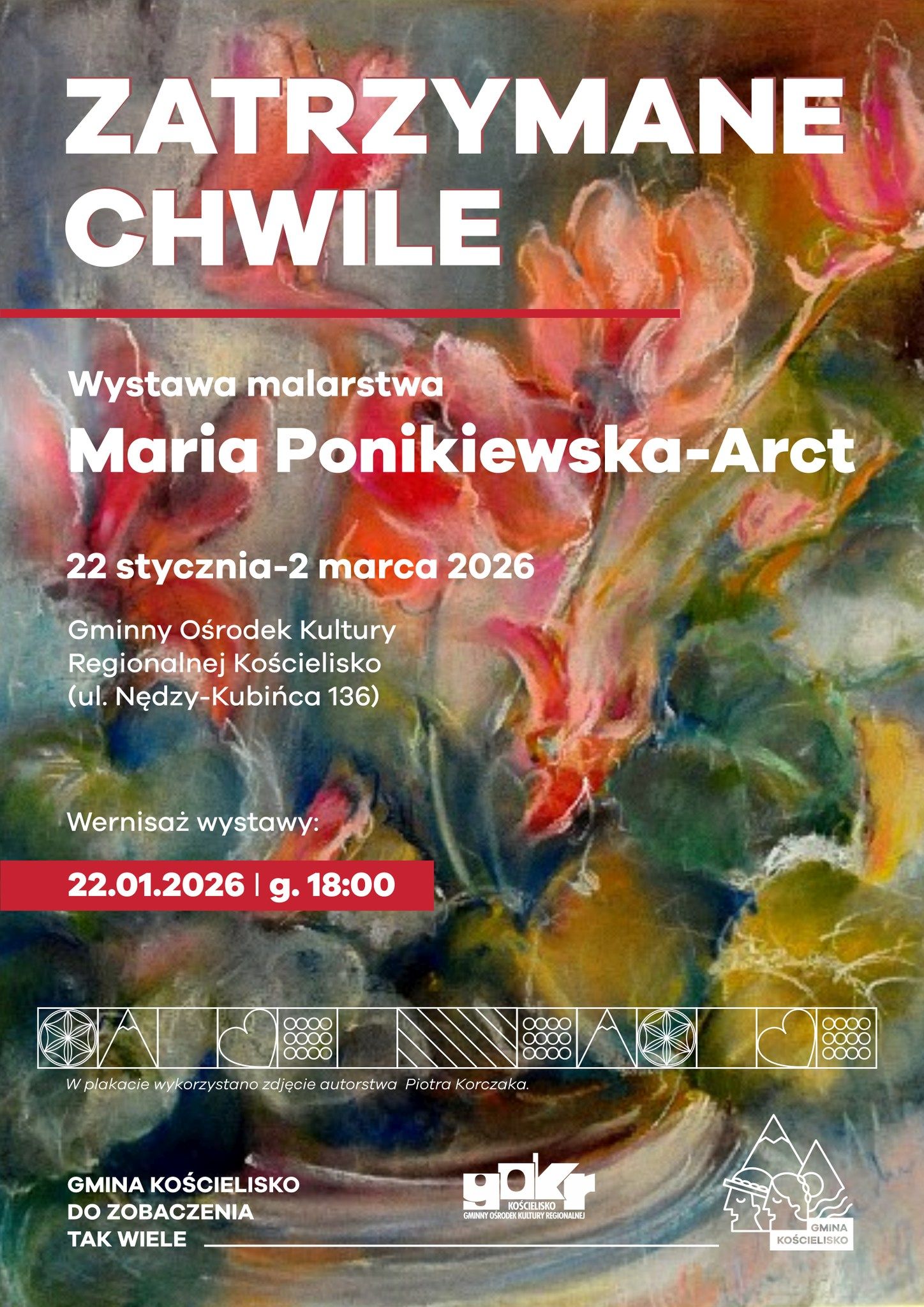 Gminnym Ośrodek Kultury Regionalnej Kościelisko zaprasza na wystawę malarstwa Marii Ponikiewskiej-Arct - artystki, której twórczość łączy architektoniczną wrażliwość z malarską pasją, wyczuciem koloru, światła i formy.