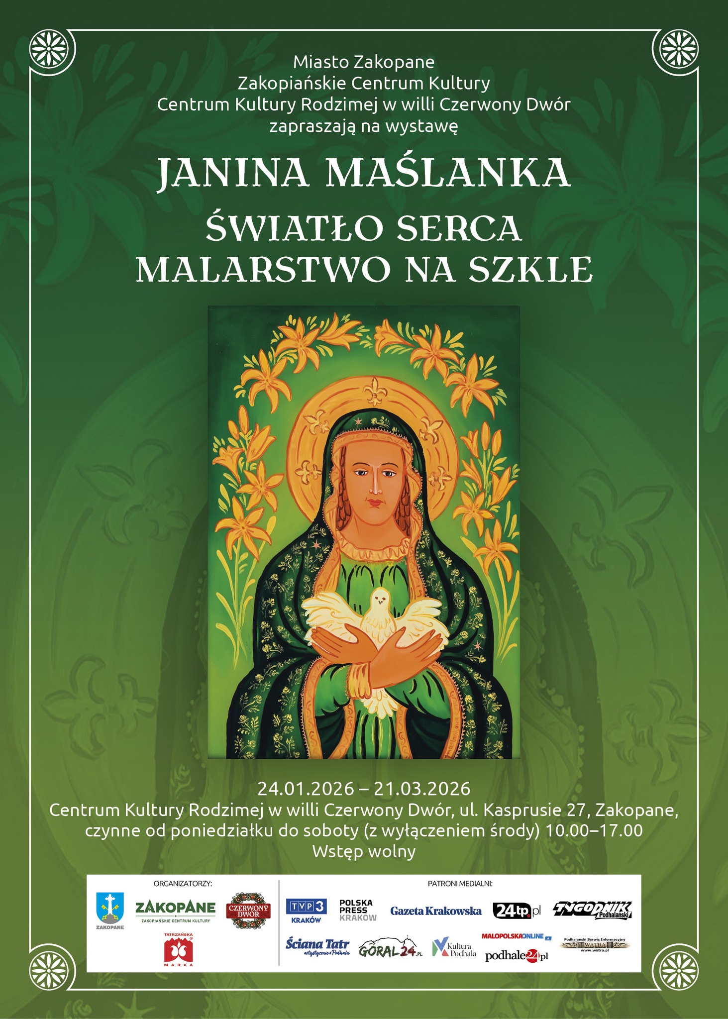 Miasto Zakopane, Zakopiańskie Centrum Kultury, Centrum Kultury Rodzimej w willi Czerwony Dwór zapraszają na wernisaż wystawy "Janina Maślanka. Światło serca - malarstwo na szkle".
