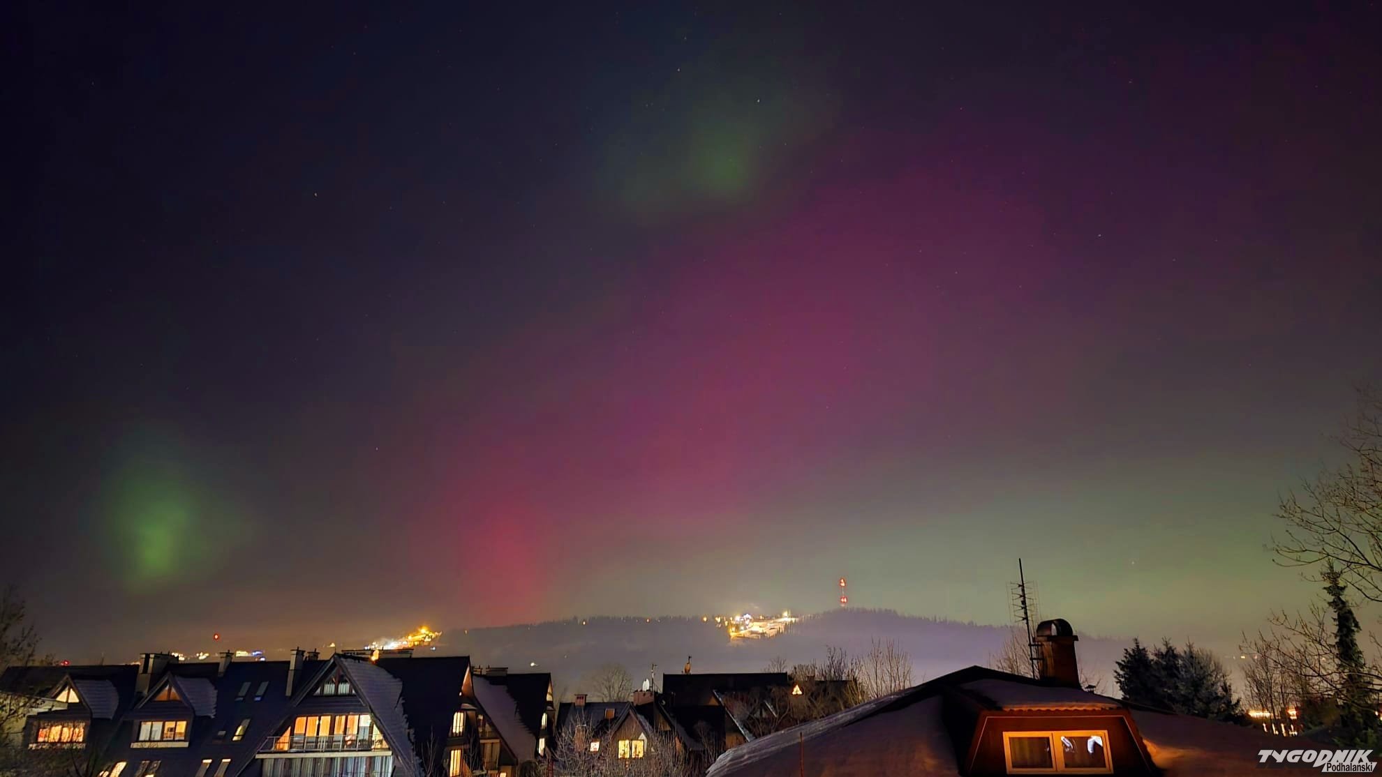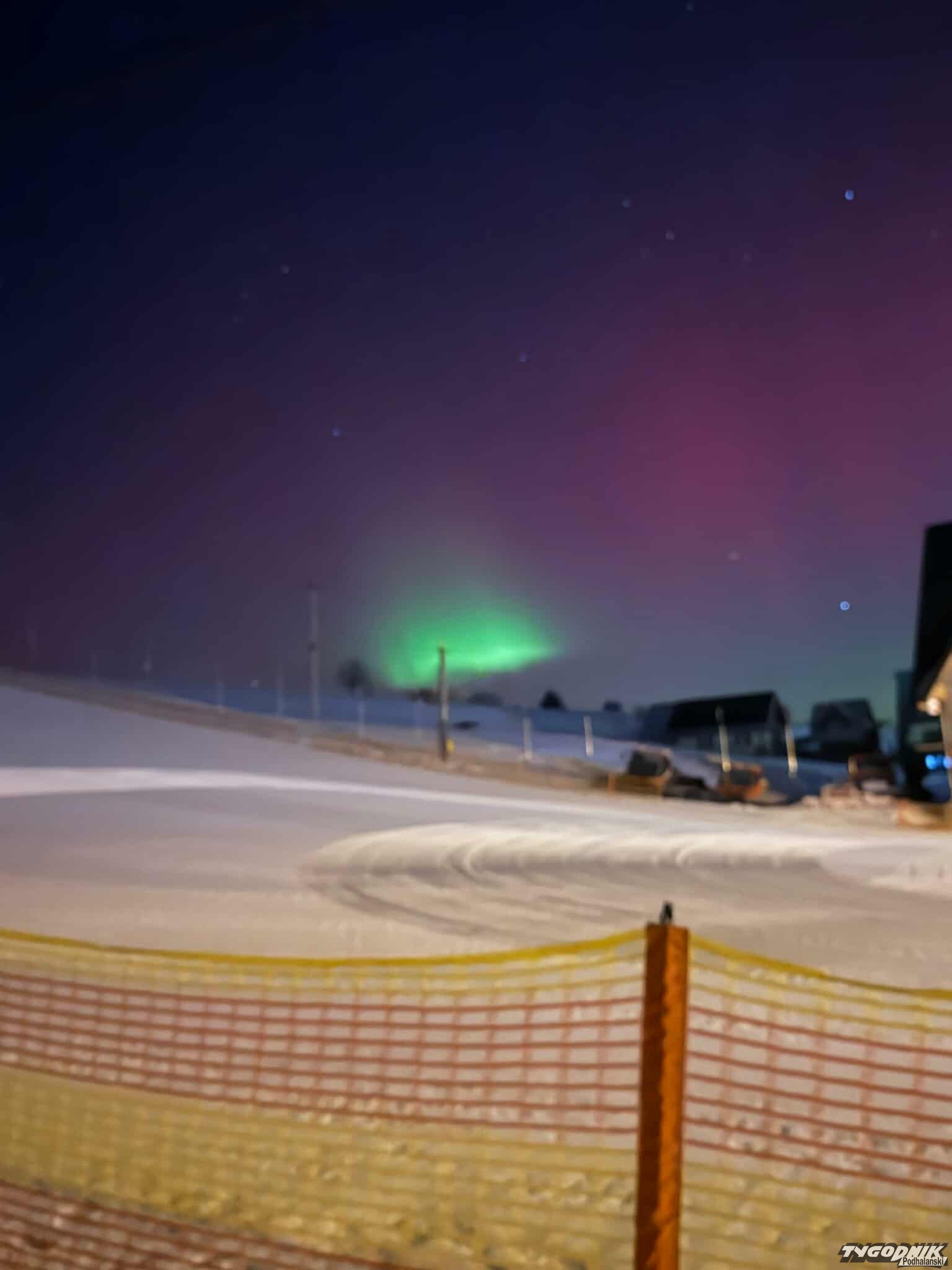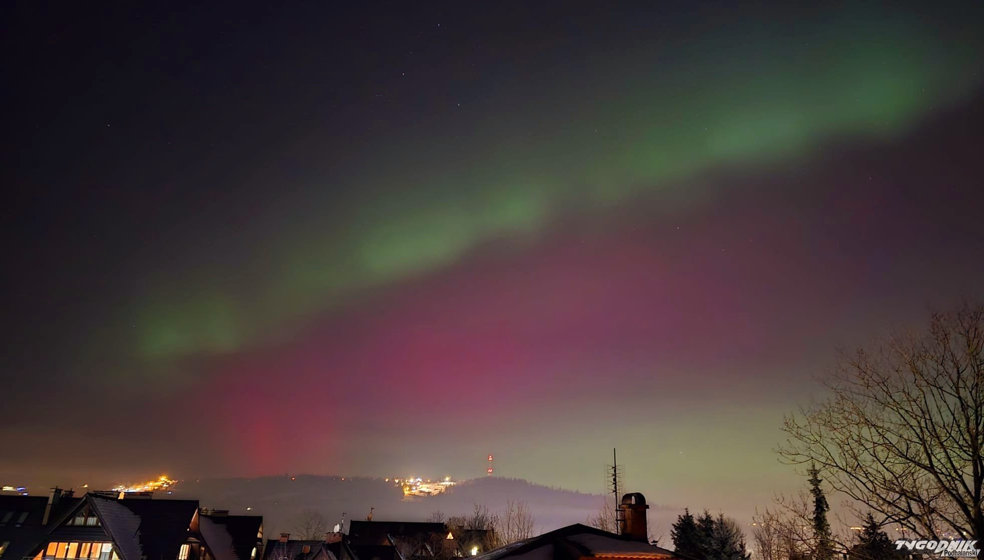 Jak mówi nasz reporter Bartłomiej Jurecki, który często jeździ do Skandynawii fotografować zorze, tak wyraźnego zjawiska na Podhalu jeszcze nie było. Momentami zorza przybiera zielony kolor. Zjawisko jest dziś widoczne we wielu miejscach w naszym kraju.