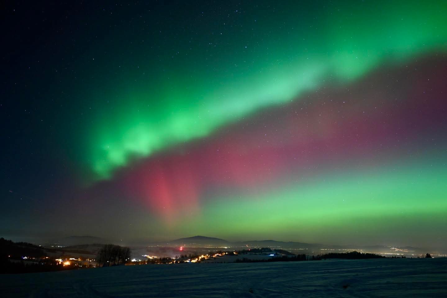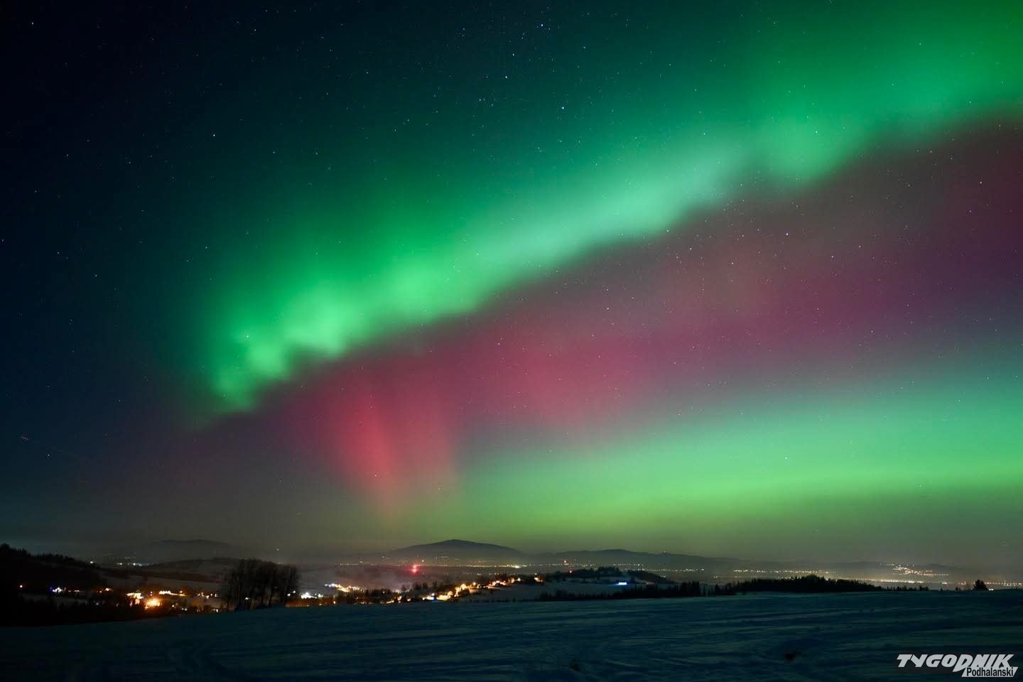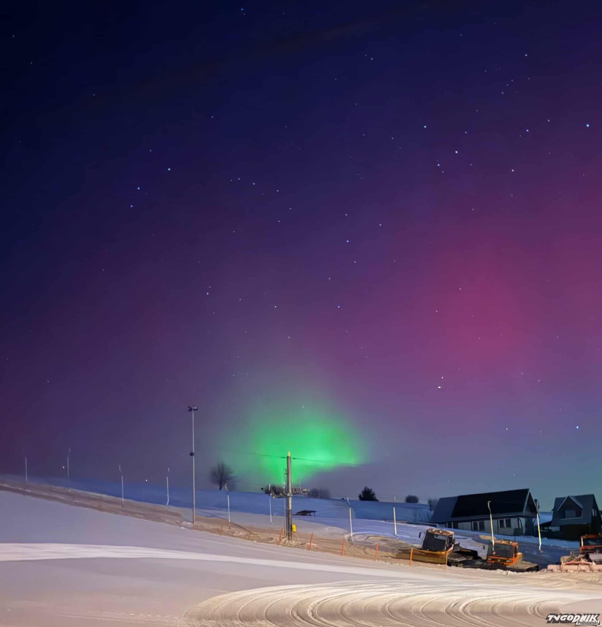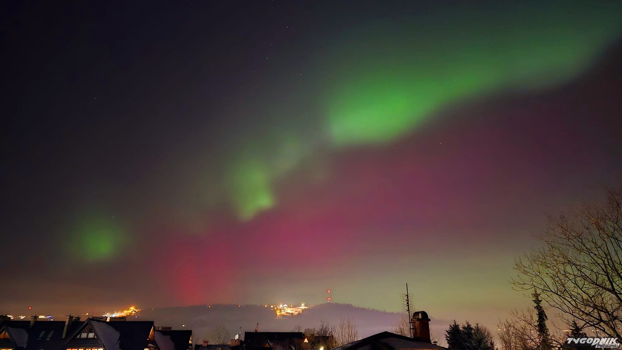 Jak mówi nasz reporter Bartłomiej Jurecki, który często jeździ do Skandynawii fotografować zorze, tak wyraźnego zjawiska na Podhalu jeszcze nie było. Momentami zorza przybiera zielony kolor. Zjawisko jest dziś widoczne we wielu miejscach w naszym kraju.